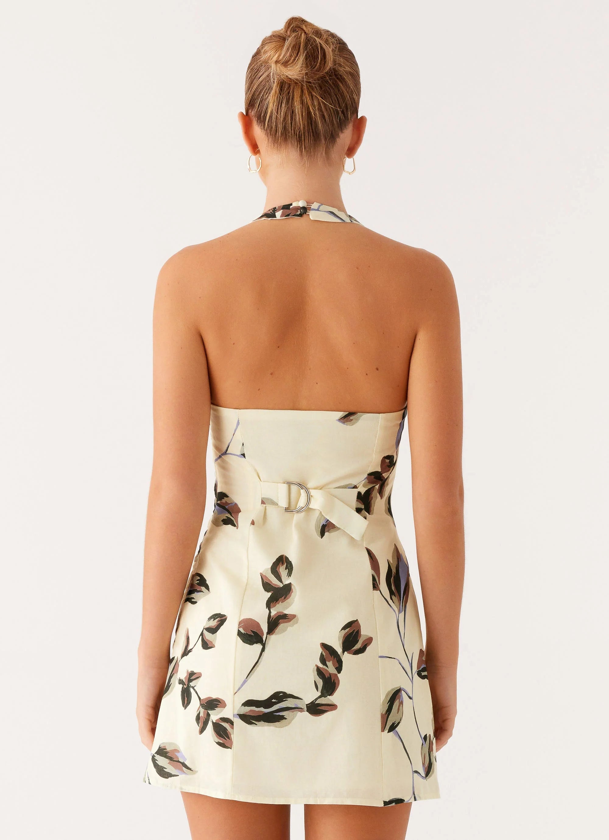 The Noa Mini Dress is a statement silhouette featuring a low neckline, front metal embellishment, and open back. Designed in an exclusive print, this mini-length piece is made to turn heads from every angle.