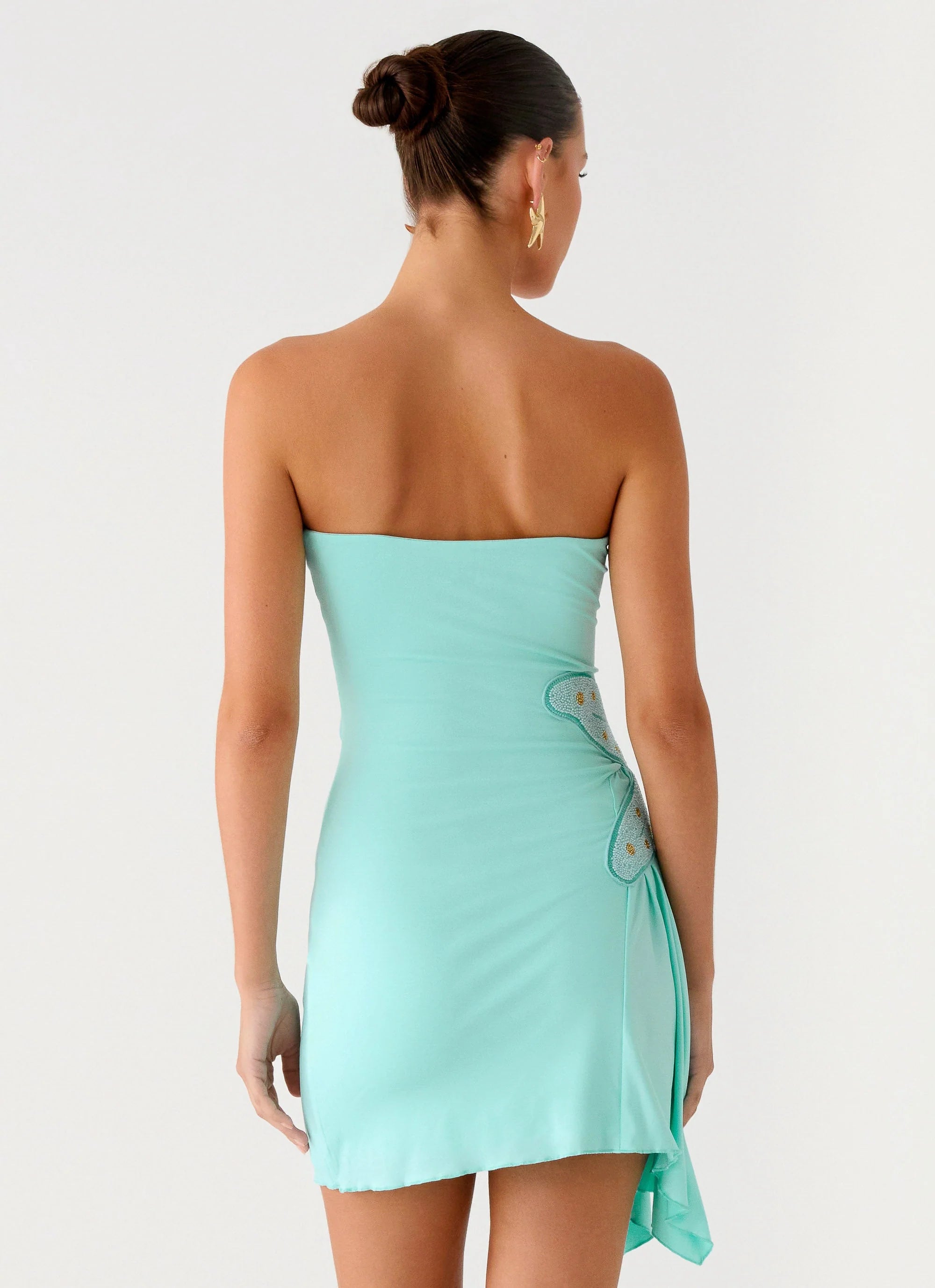 Make a statement in the Ocean Dream Strapless Mini Dress. This dreamy mini features a strapless neckline with a ruched bodice, crafted from stretch jersey for a sleek and flattering fit. Delicate starfish embroidery with bead detailing adds a touch of coastal glamour, making it the perfect party or vacation piece.