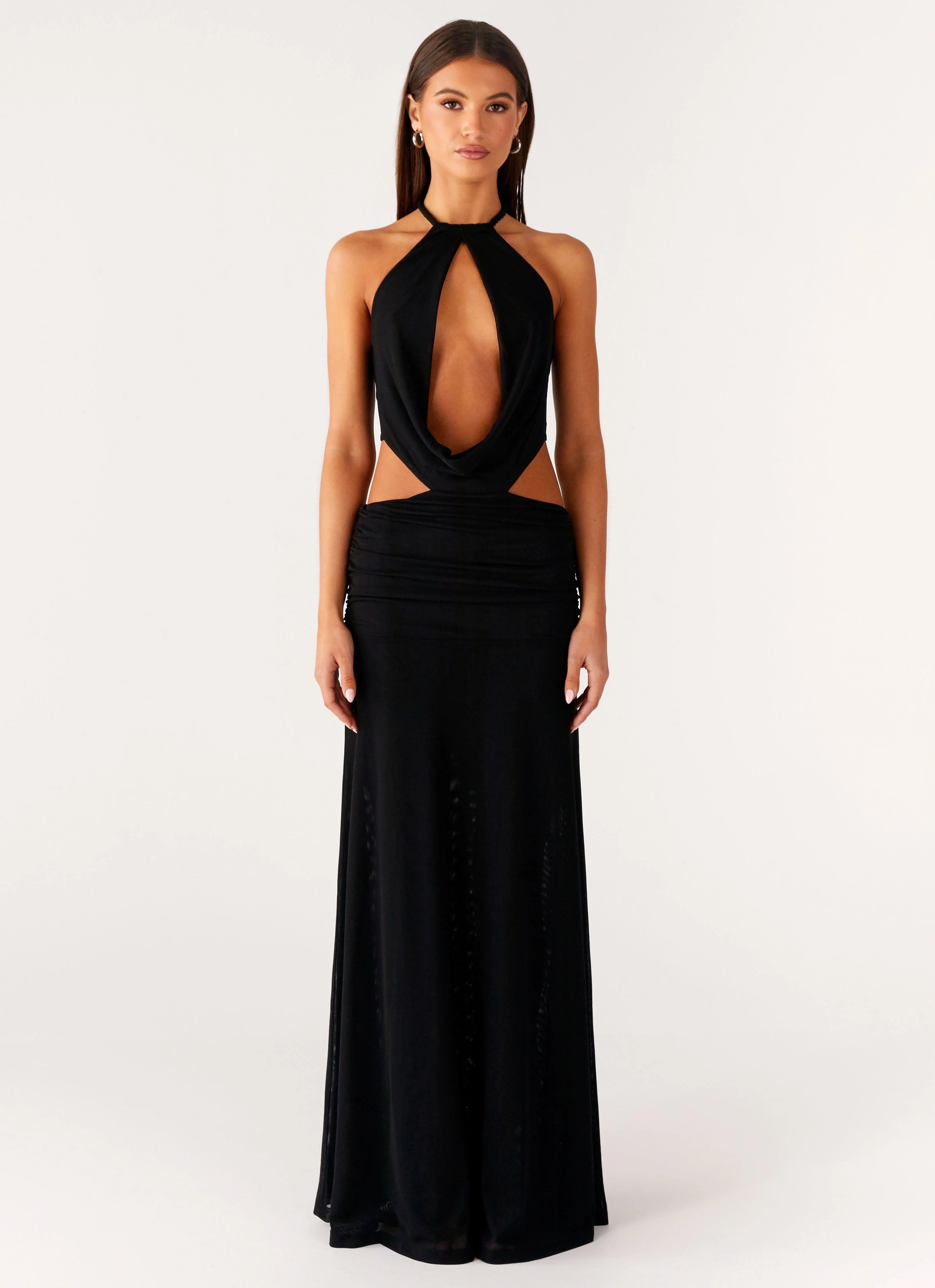 The Only Love Maxi Dress is made for after-dark allure. Featuring a front cowl cut-out, side cut-outs, and a back tie with thin neck tie strap, this fully lined stretch mesh maxi is finished with side waist ruching for a flattering silhouette.