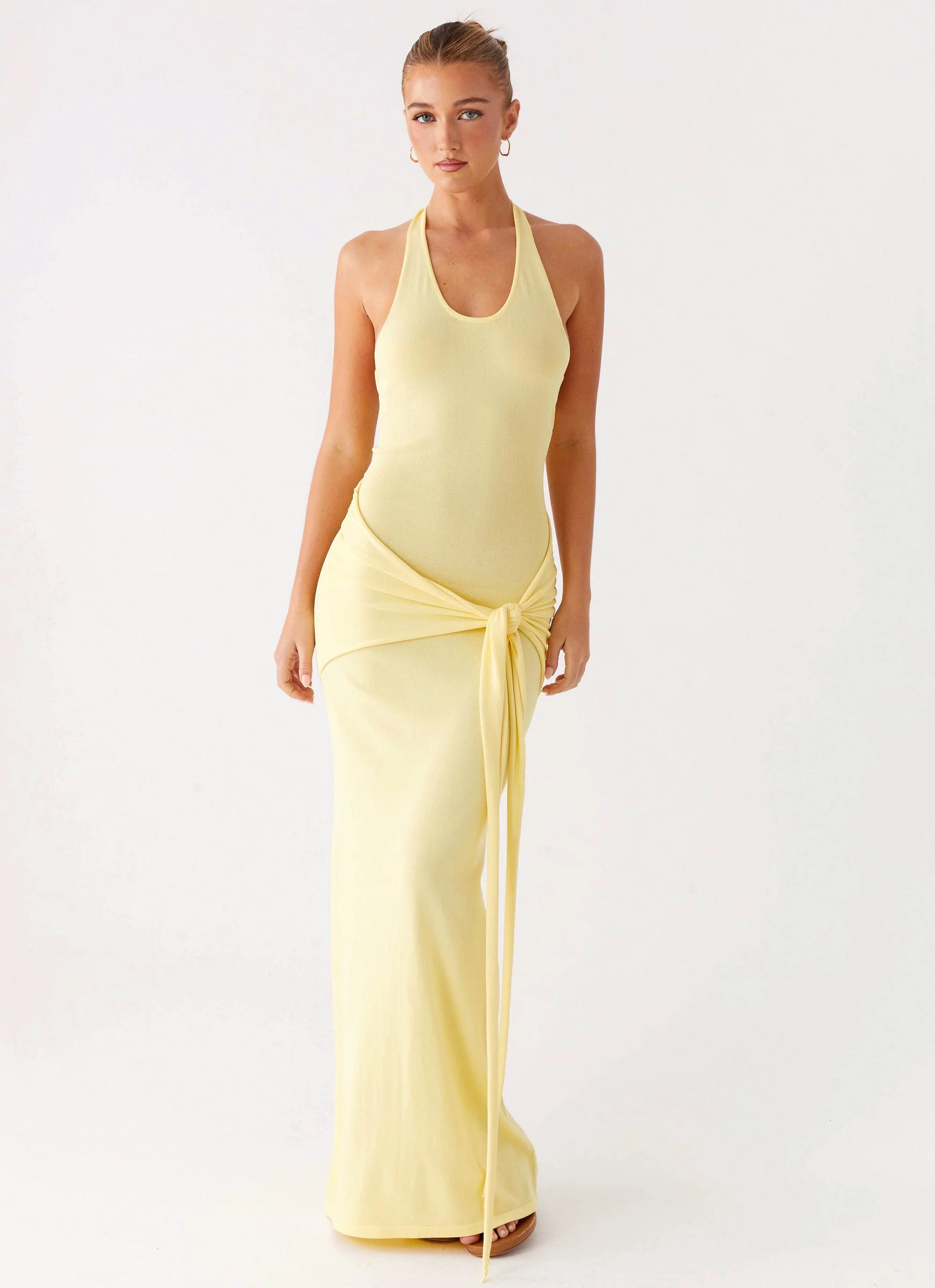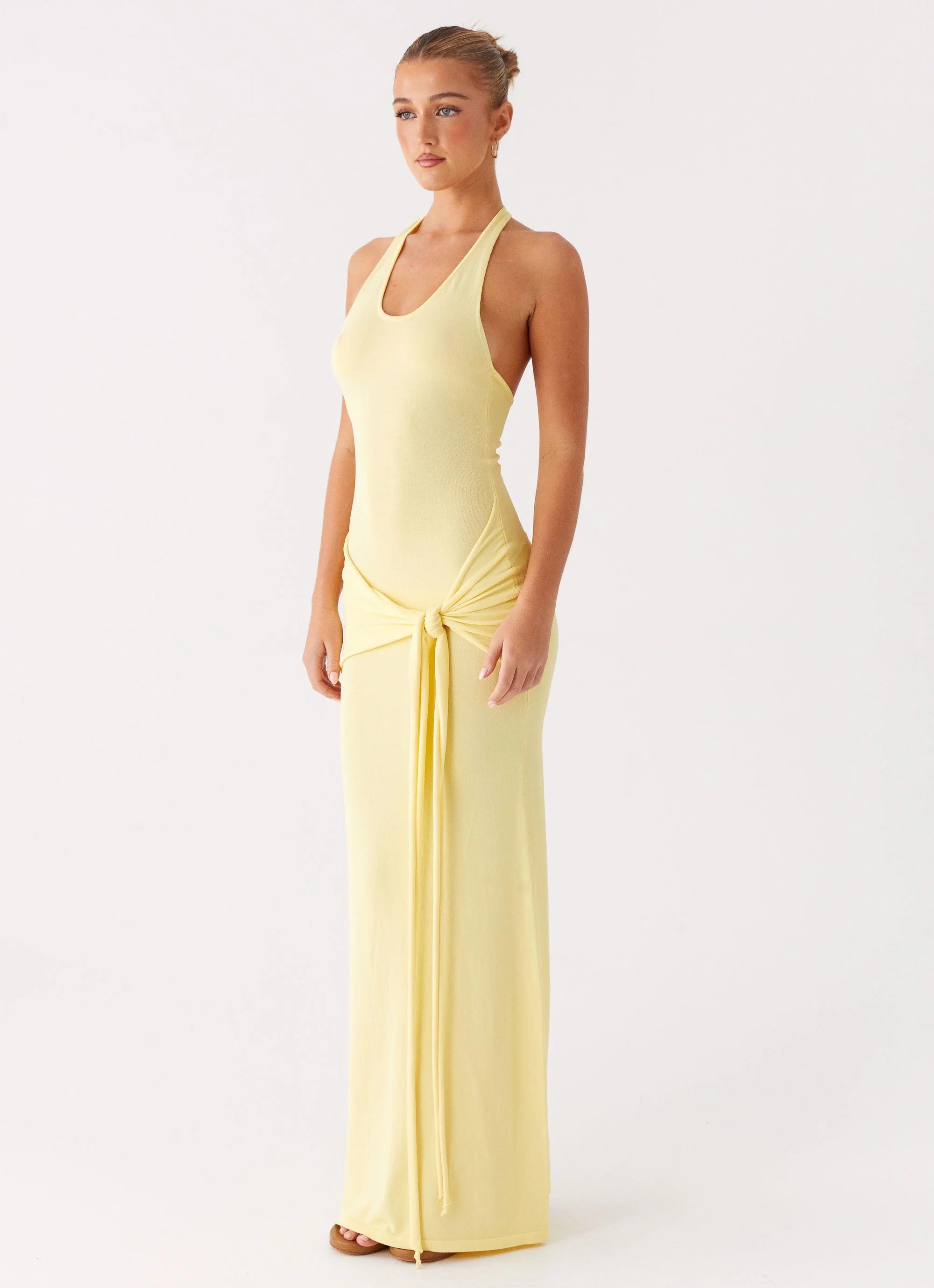 Sip, sway, and soak in the sunset in the Pina Colada Knit Maxi Dress. Crafted from a soft stretch knit, this unlined maxi features a rounded neckline with a flirty front tie. Perfect for balmy nights and barefoot dancing.