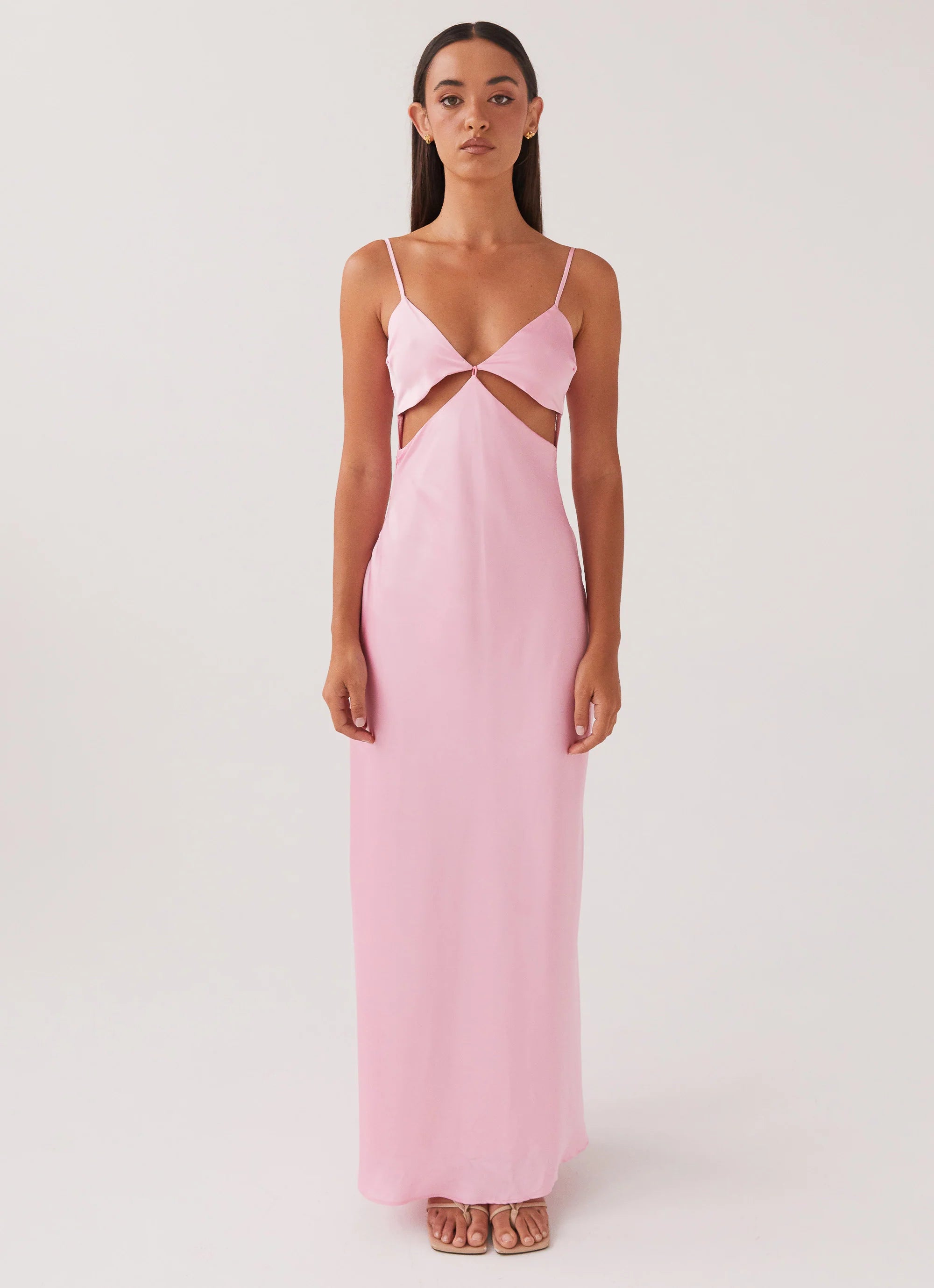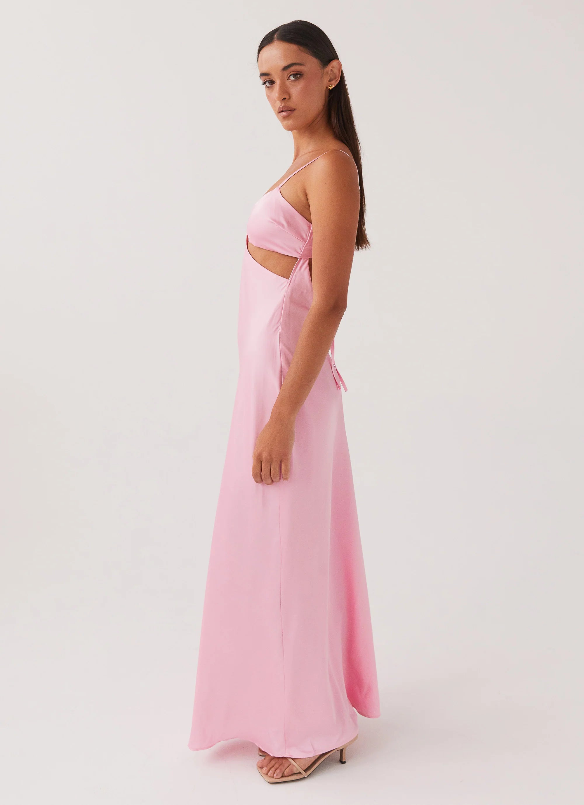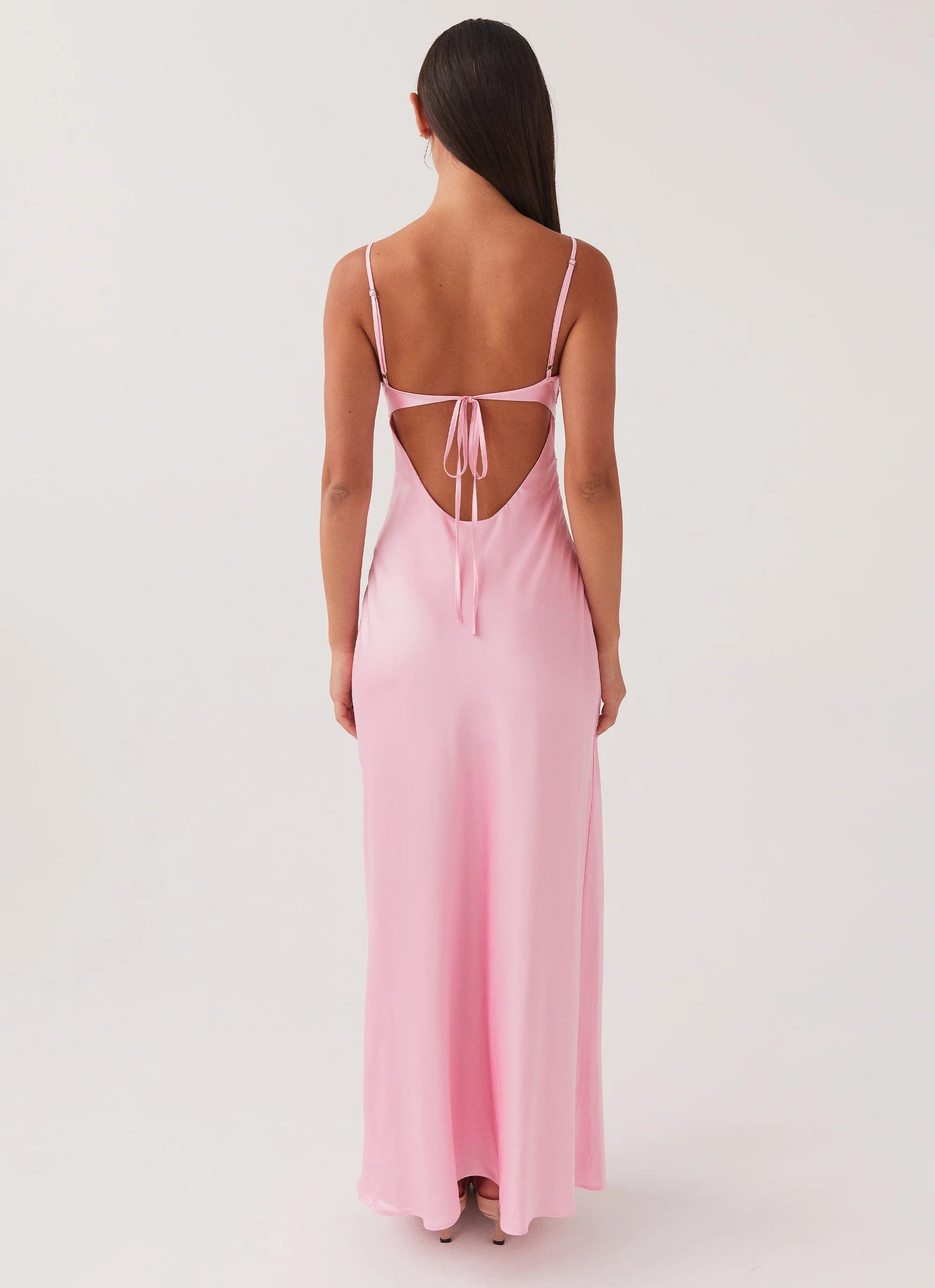 Introducing our Pretty In Pink Maxi Dress. Crafted from luxurious satin fabric. With its open back detail, it adds a touch of allure to your evening look. Perfect for embracing golden skies, balmy nights, and the enchanting nightclub silhouettes.