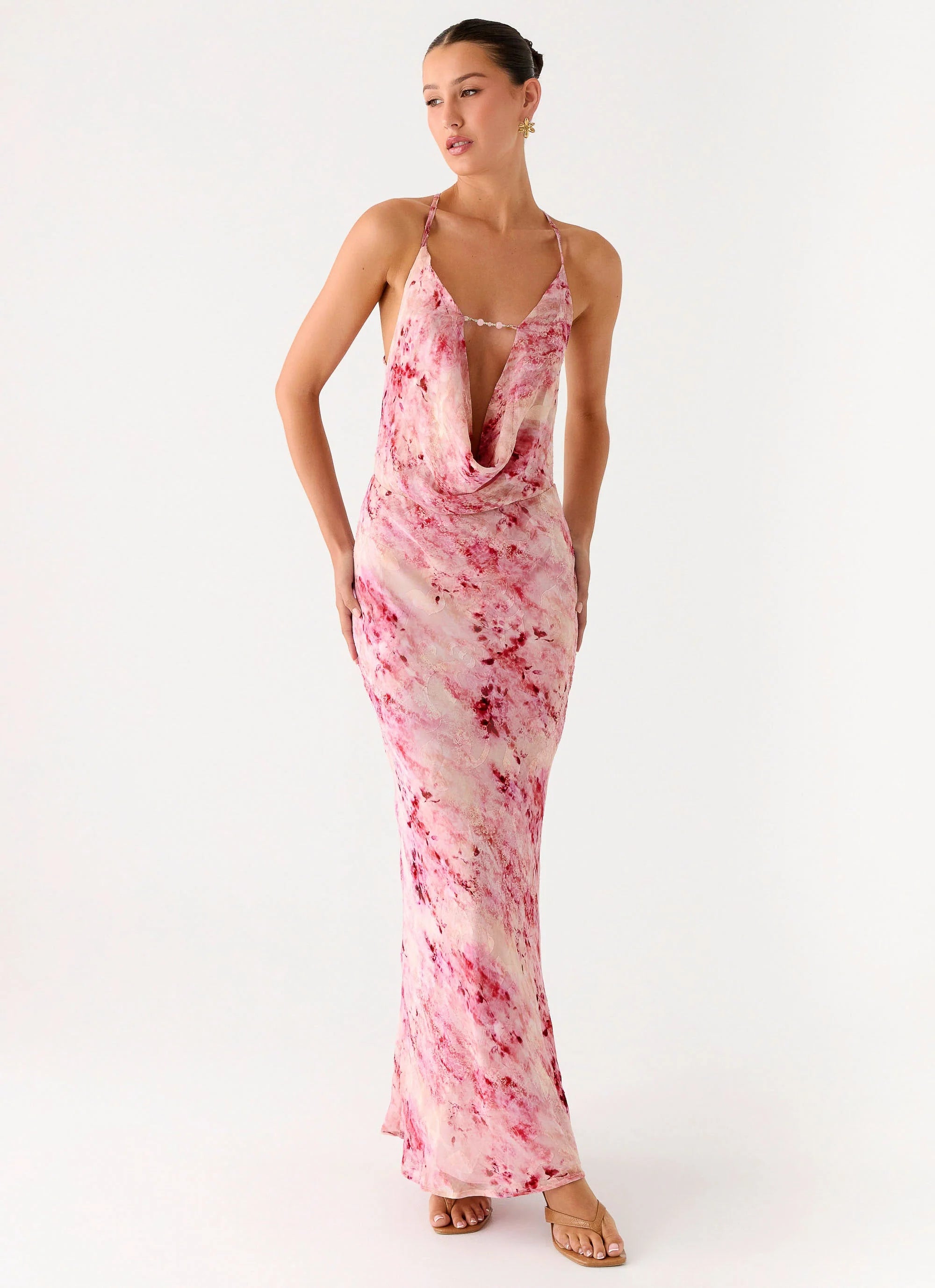 The Pure Heart Cow Maxi Dress is made for nights that never fade. Featuring a low front cowl neckline with delicate front beadings and thin adjustable straps, this maxi dress blends softness and shimmer. With a low back, stretch mesh fabric, and full lining, it’s your perfect partner from golden hour to after hours.