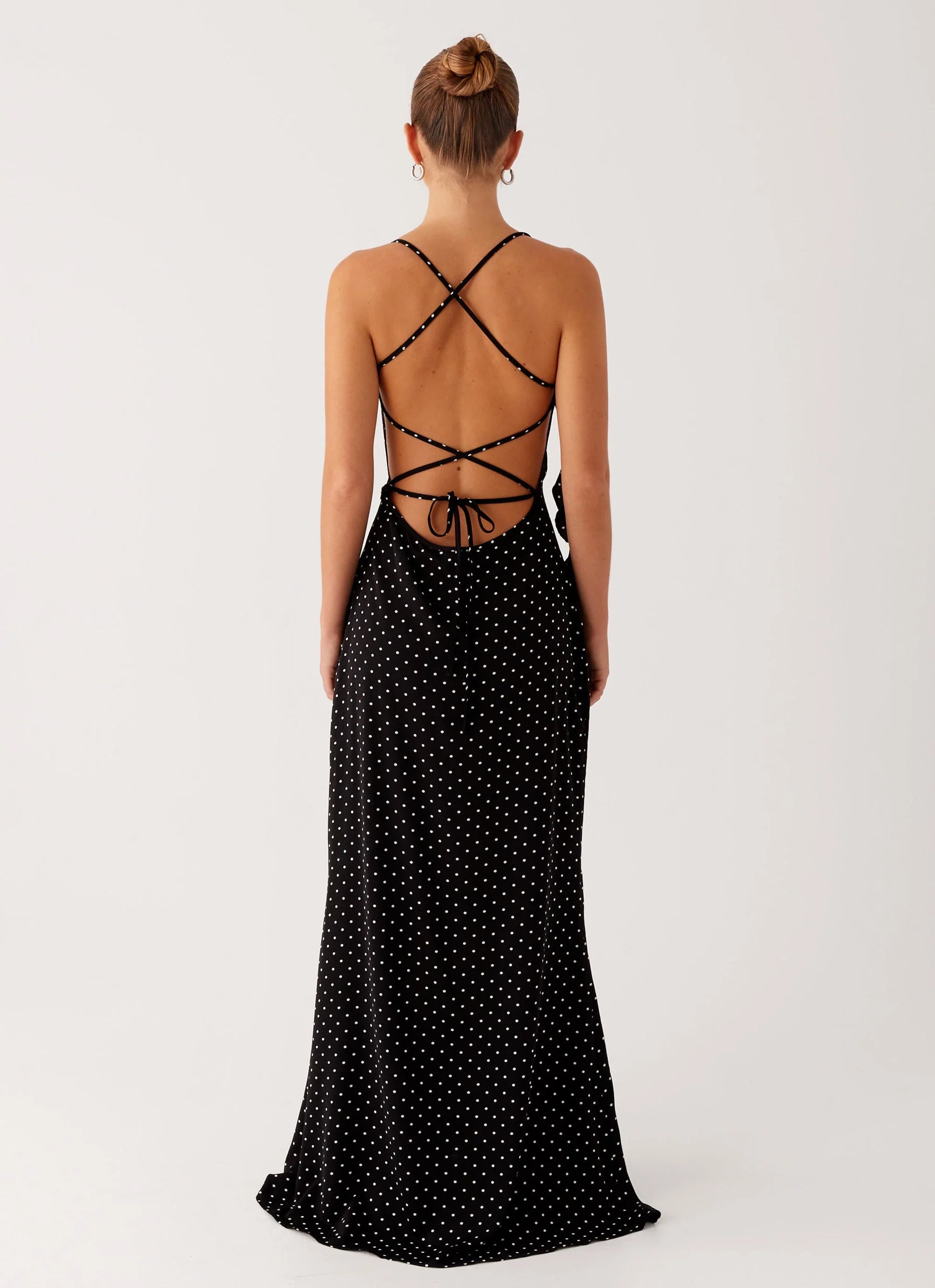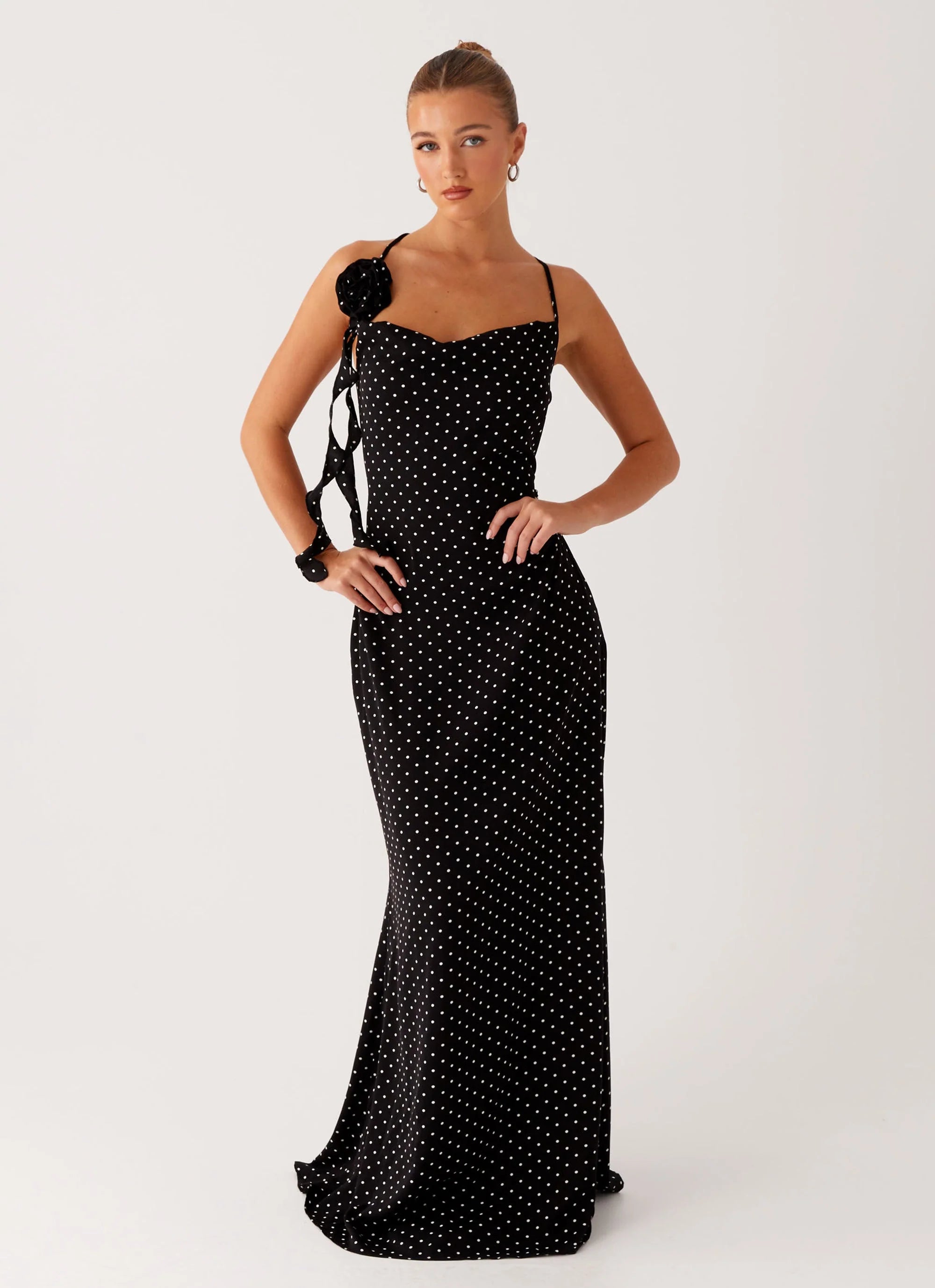The Purely Maxi Dress in black polkadot is a romantic statement, featuring a soft front cowl, thin adjustable straps, and a delicate front flower embellishment. With an exclusive print and unique placement on each piece, this fully lined maxi silhouette is made to turn heads from sunset to after-dark.