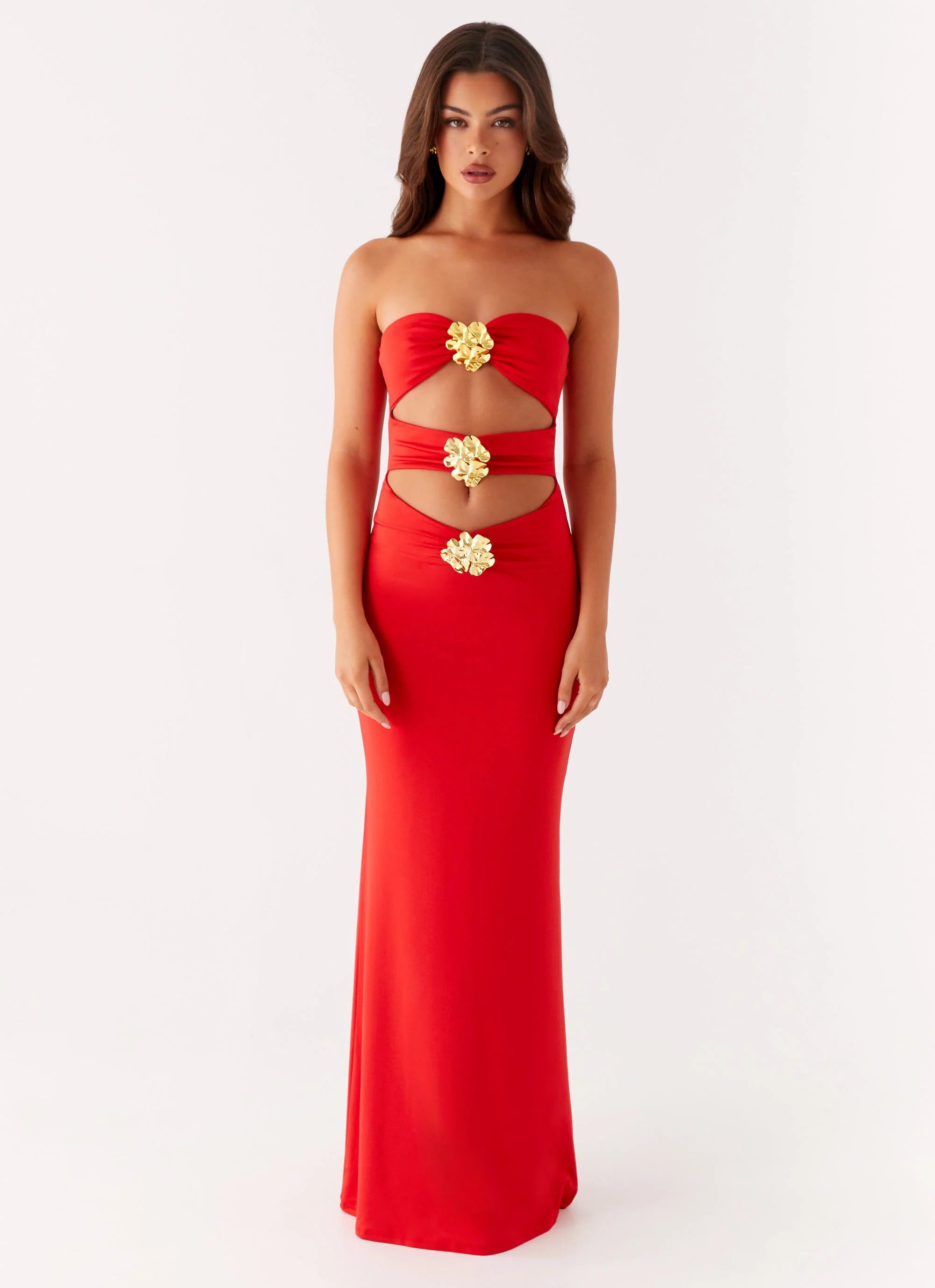 The Raye Maxi Dress is pure, daring elegance. Featuring sleek front cutouts, it’s designed to turn heads and command attention. With every movement, it flows effortlessly, perfect for those who thrive under golden skies and live for the thrill of the night.