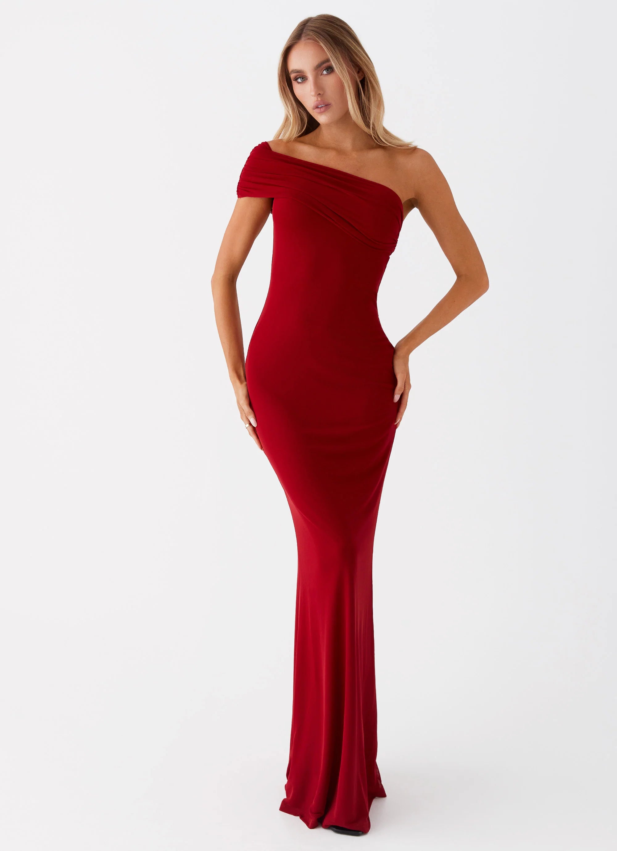 Command attention with the Reine Maxi Dress. Designed with an off-shoulder neckline, stretch mesh fabric, and ruched shoulder seams, this dress offers an effortlessly glamorous look for your most dazzling evenings.