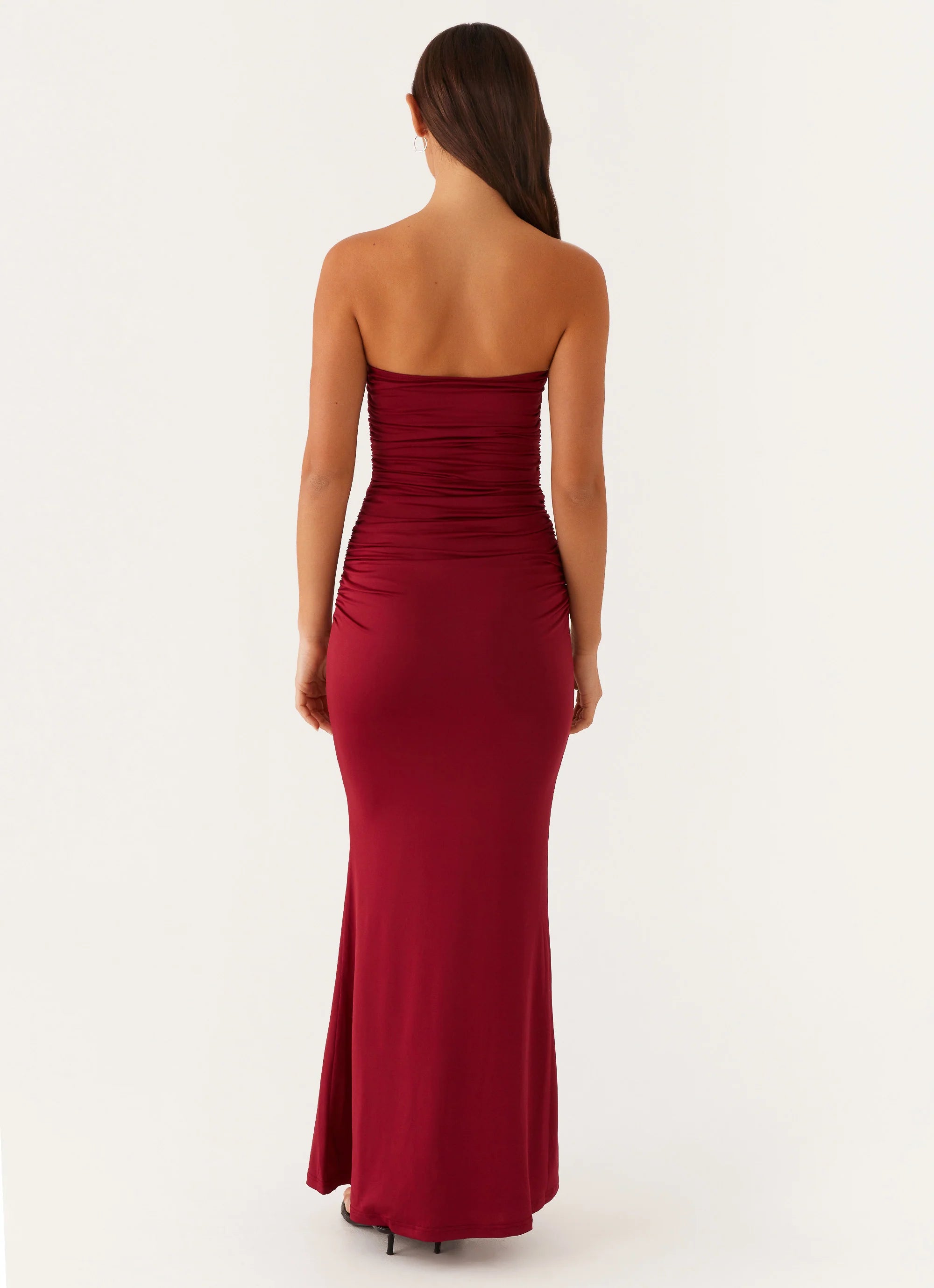 The Rudy Maxi Dress features a strapless neckline with silicone taping for a secure fit, complemented by all-around ruching for a flattering silhouette. This design offers a timeless and elegant look, perfect for evening events or special occasions.
