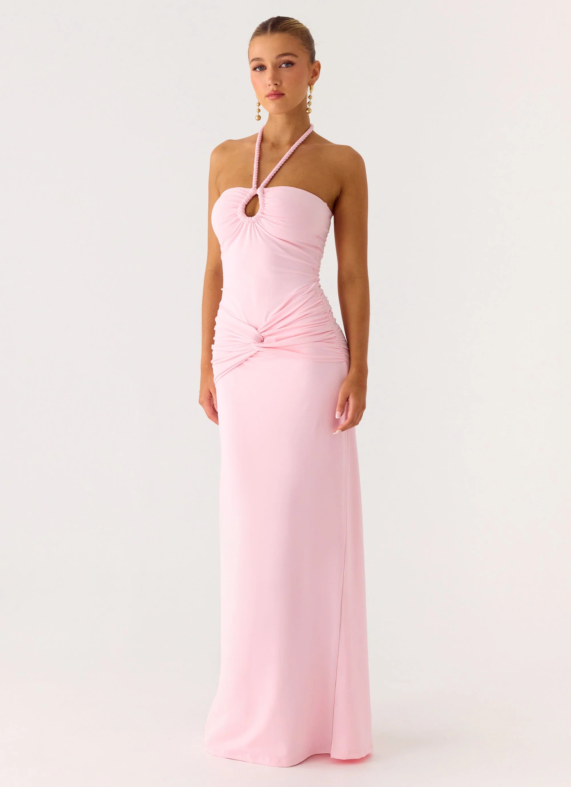 The Sacred Maxi Dress is made for glowing nights and golden skies. Featuring a halter neckline with front keyhole cut-out, ruched bustier and centre waist, and a low back finished with a thin neck tie strap. Crafted in stretch jersey and self-lined for a sleek fit.