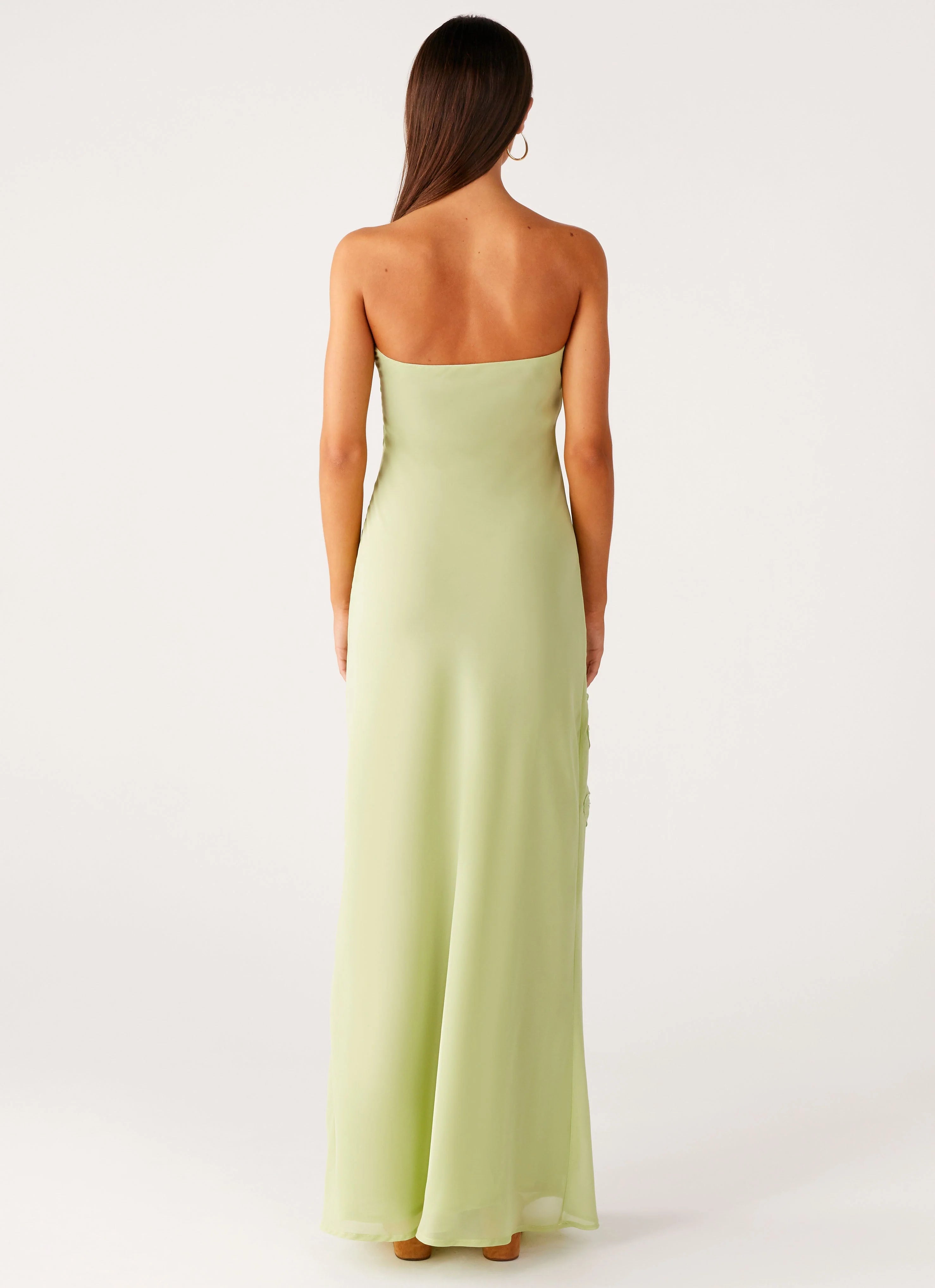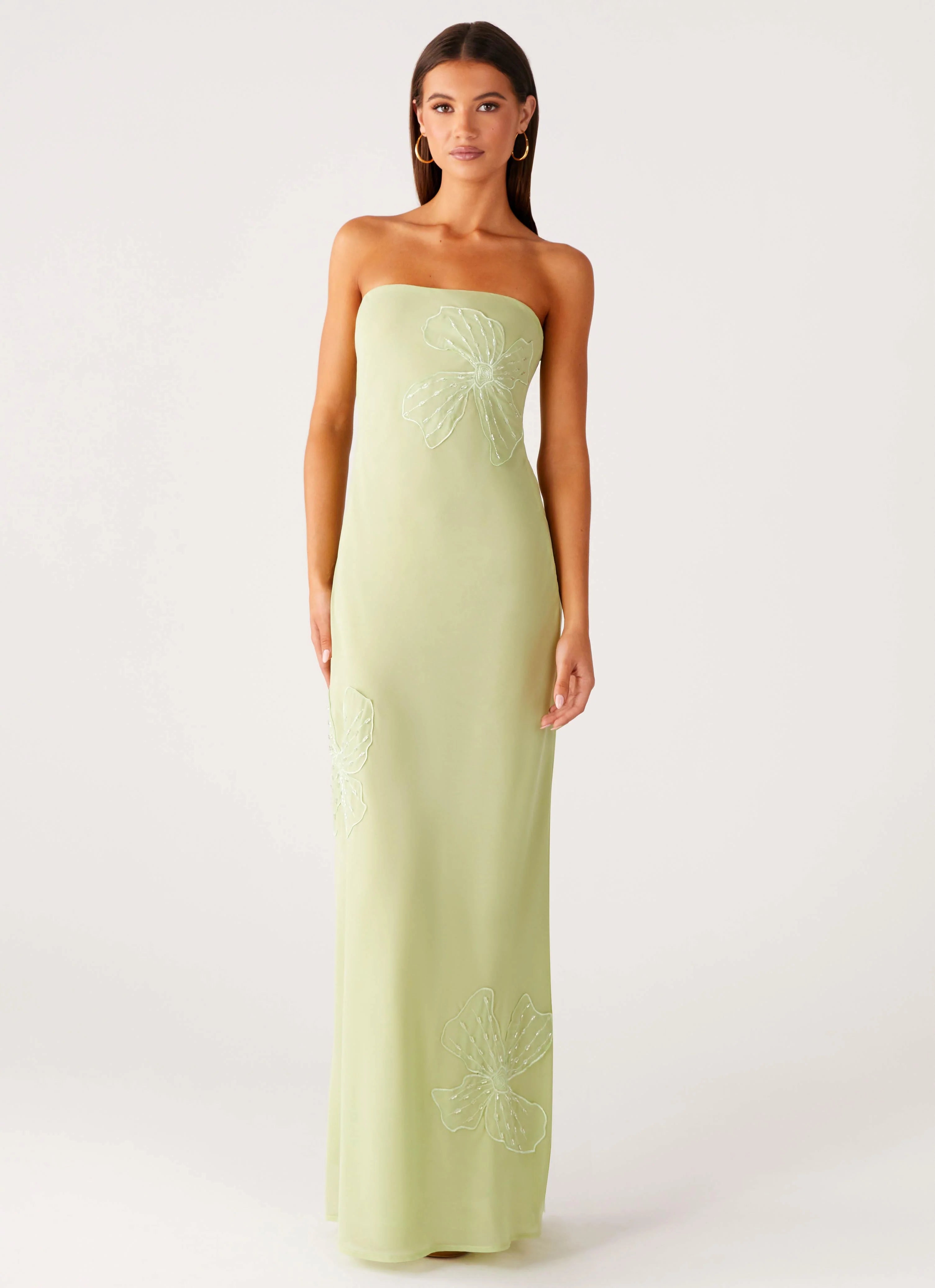 The Sassafras Beaded Flower Strapless Maxi Dress in lime green is your go-to for unforgettable nights under glowing skies. This strapless silhouette is adorned with intricate beaded flower detailing that catches the light with every move. Designed to make you shine from golden hour to late-night vibes, it’s the ultimate statement for those who live for the night.