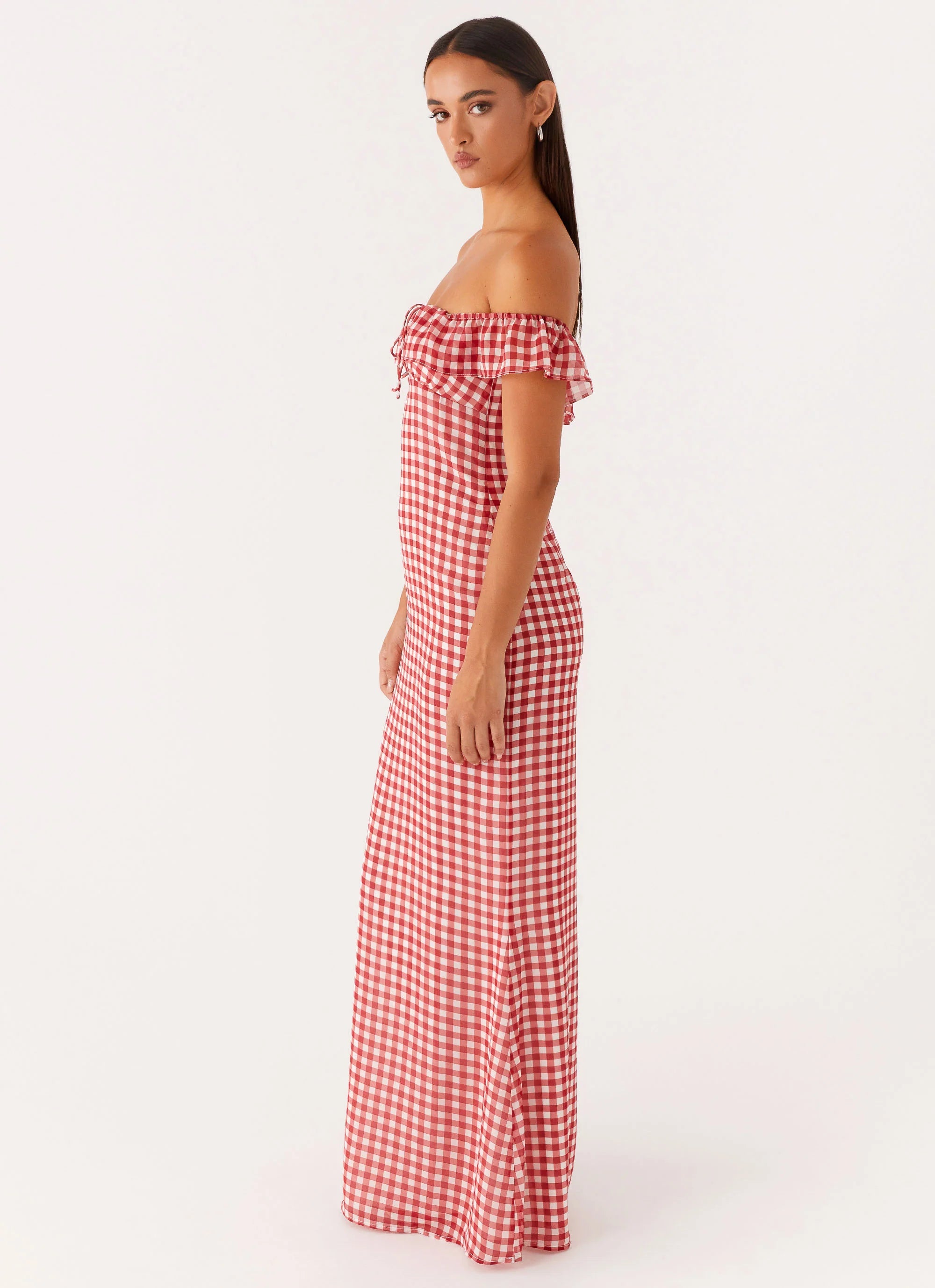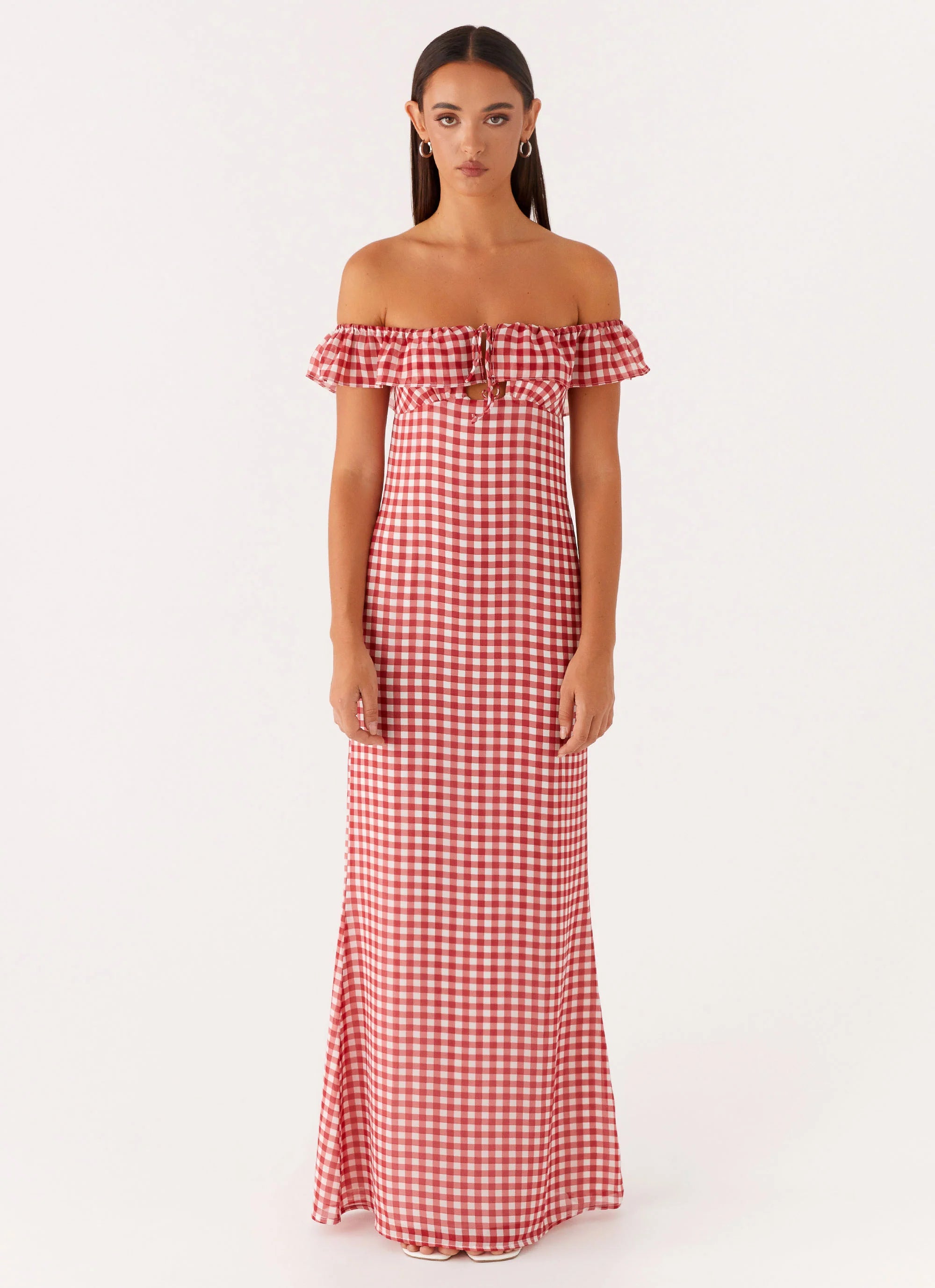 The Scarlet Cherry Maxi Dress is effortlessly romantic. Featuring an off-shoulder neckline, front tie detail, and an exclusive print, it’s made for golden skies and balmy nights.