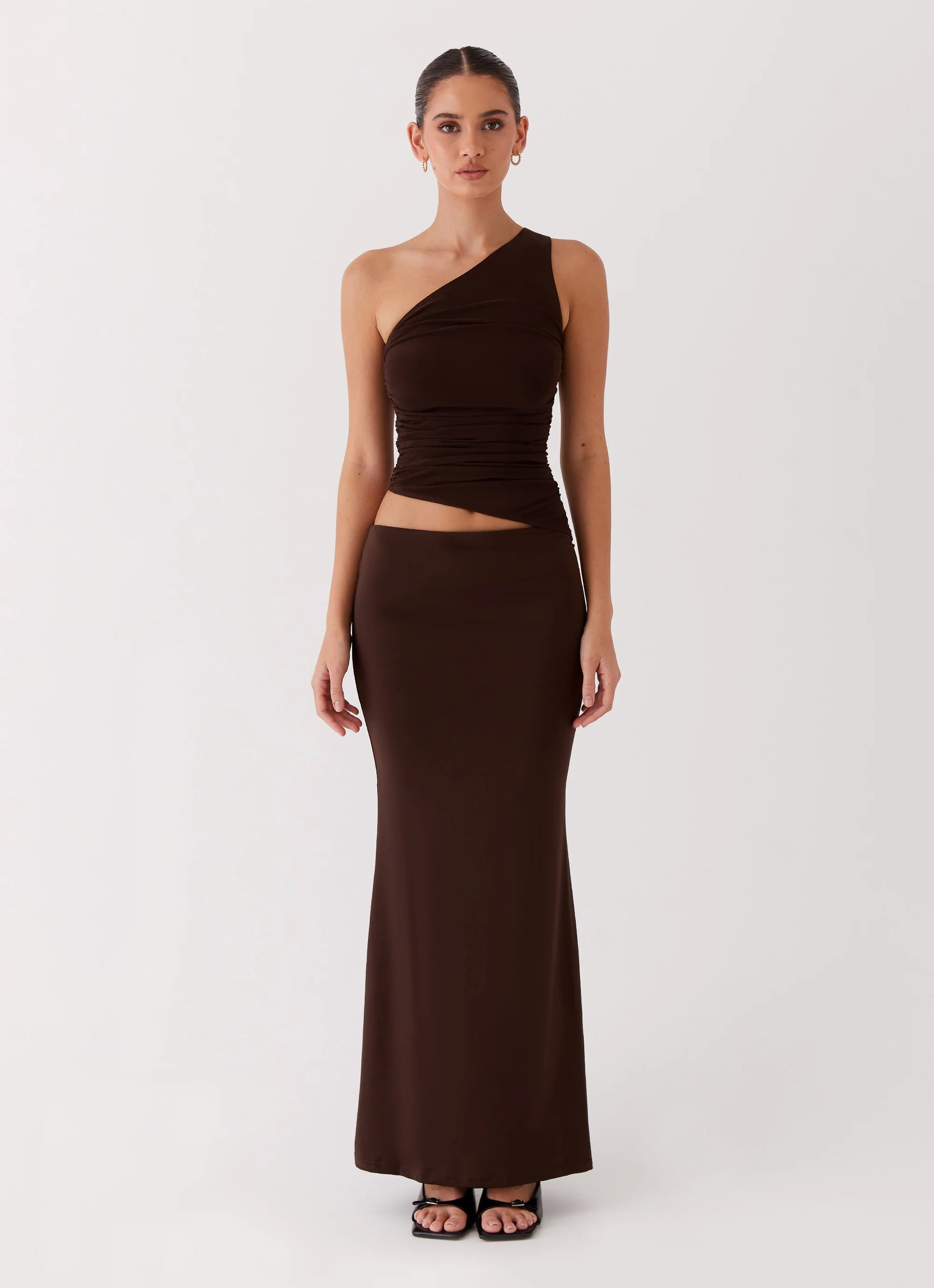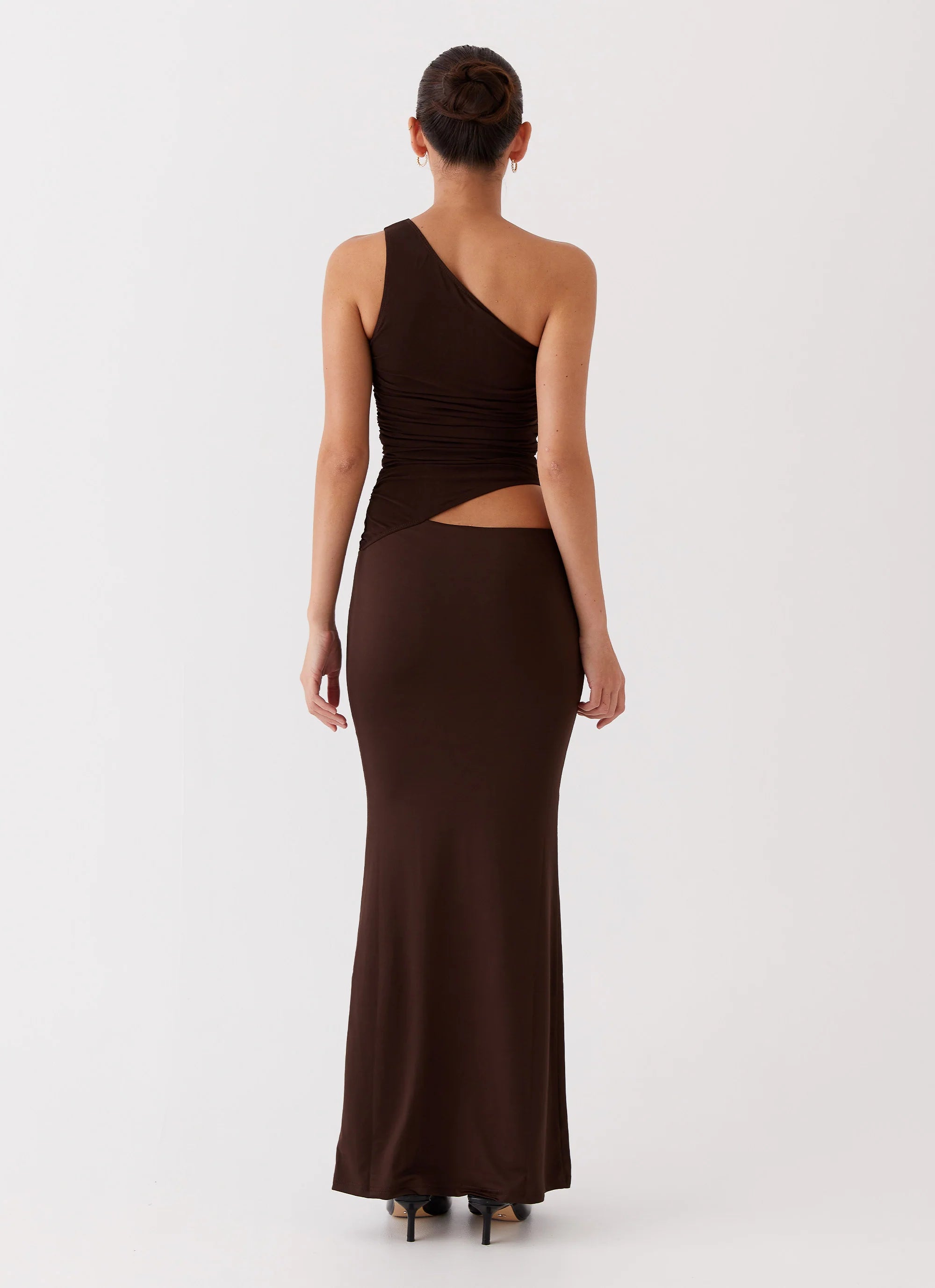 Introducing the Seranella One Shoulder Maxi Dress in Chocolate. Featuring a mesh bodice, jersey skirt, and chic cut-out waist detail, this dress is sure to turn heads. Pair with heels for your next event and embrace golden skies.