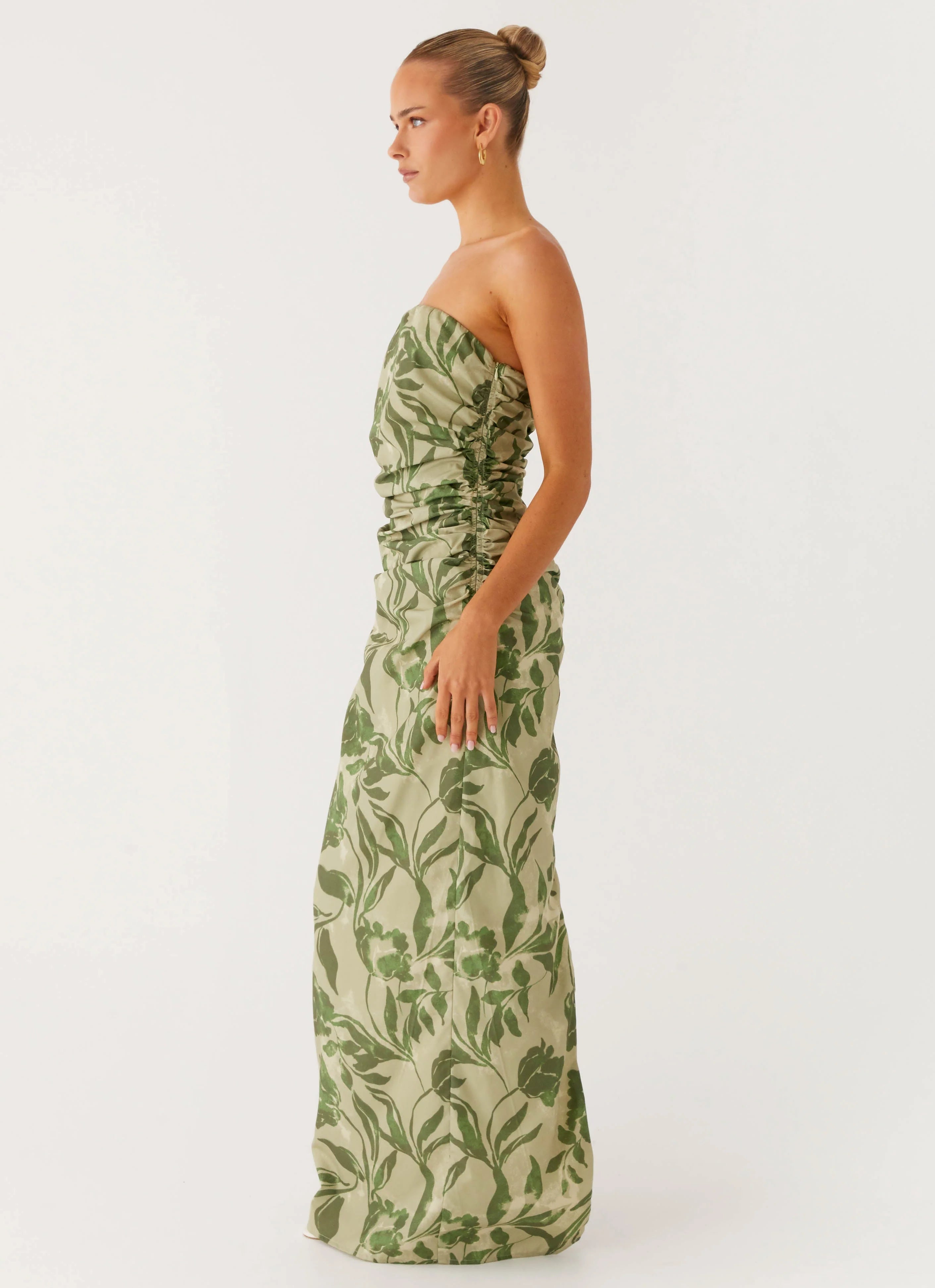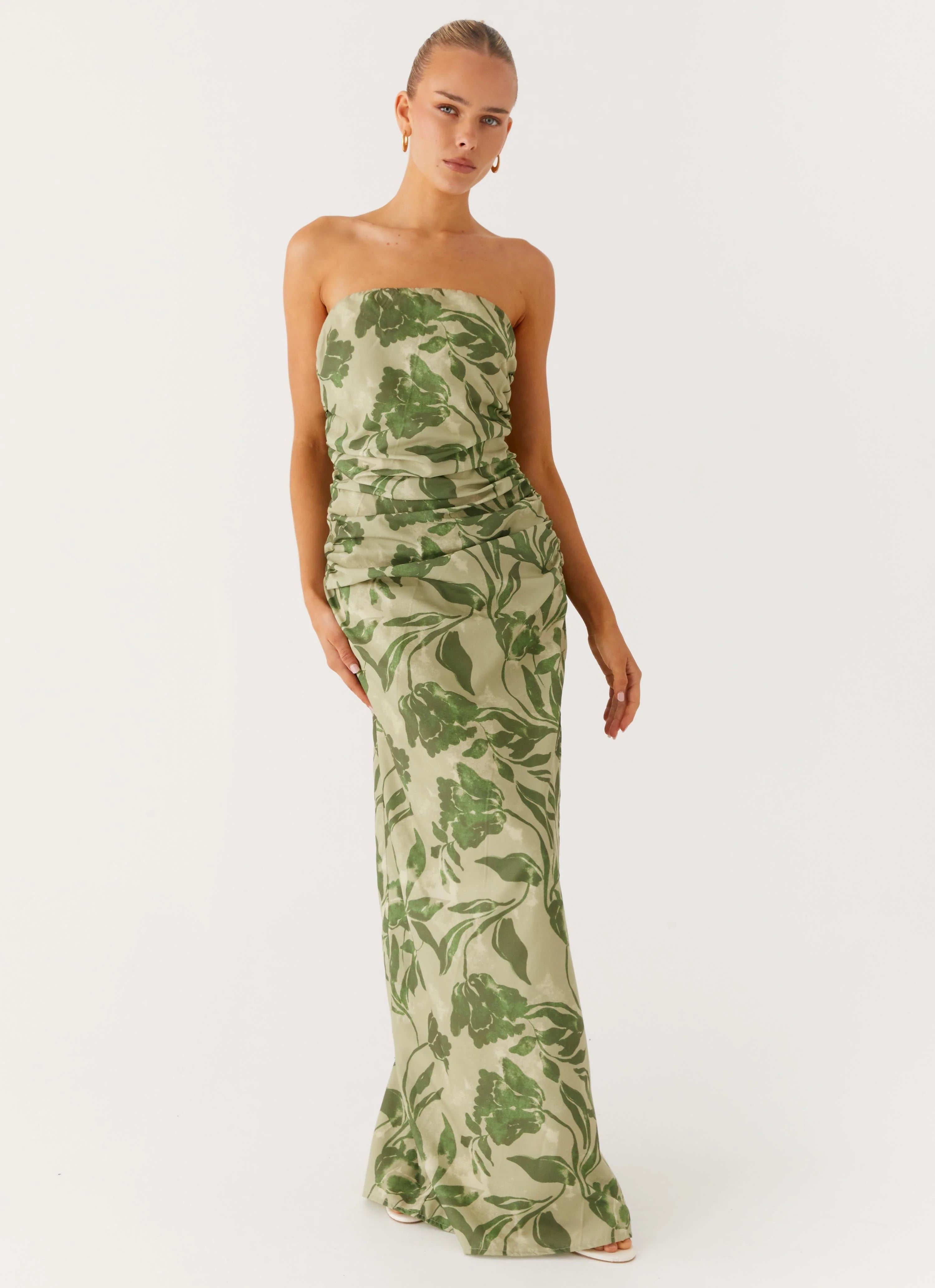 The Sirrah Maxi Dress offers a delicate floral design and strapless neckline with silicone taping for a secure fit. Featuring a flowing maxi length and ruched sides, it combines elegance with flattering detail.