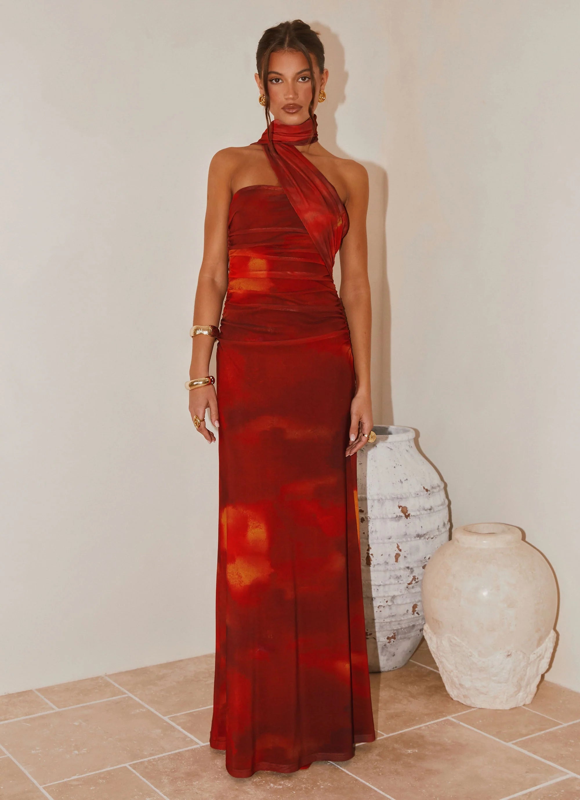 The Songbird Maxi Dress is made for magical nights and golden hour moments. Featuring a strapless neckline and ruched sides, this fully lined stretch mesh maxi is finished with a thick tie-around scarf in our exclusive Scarlet Blur print.