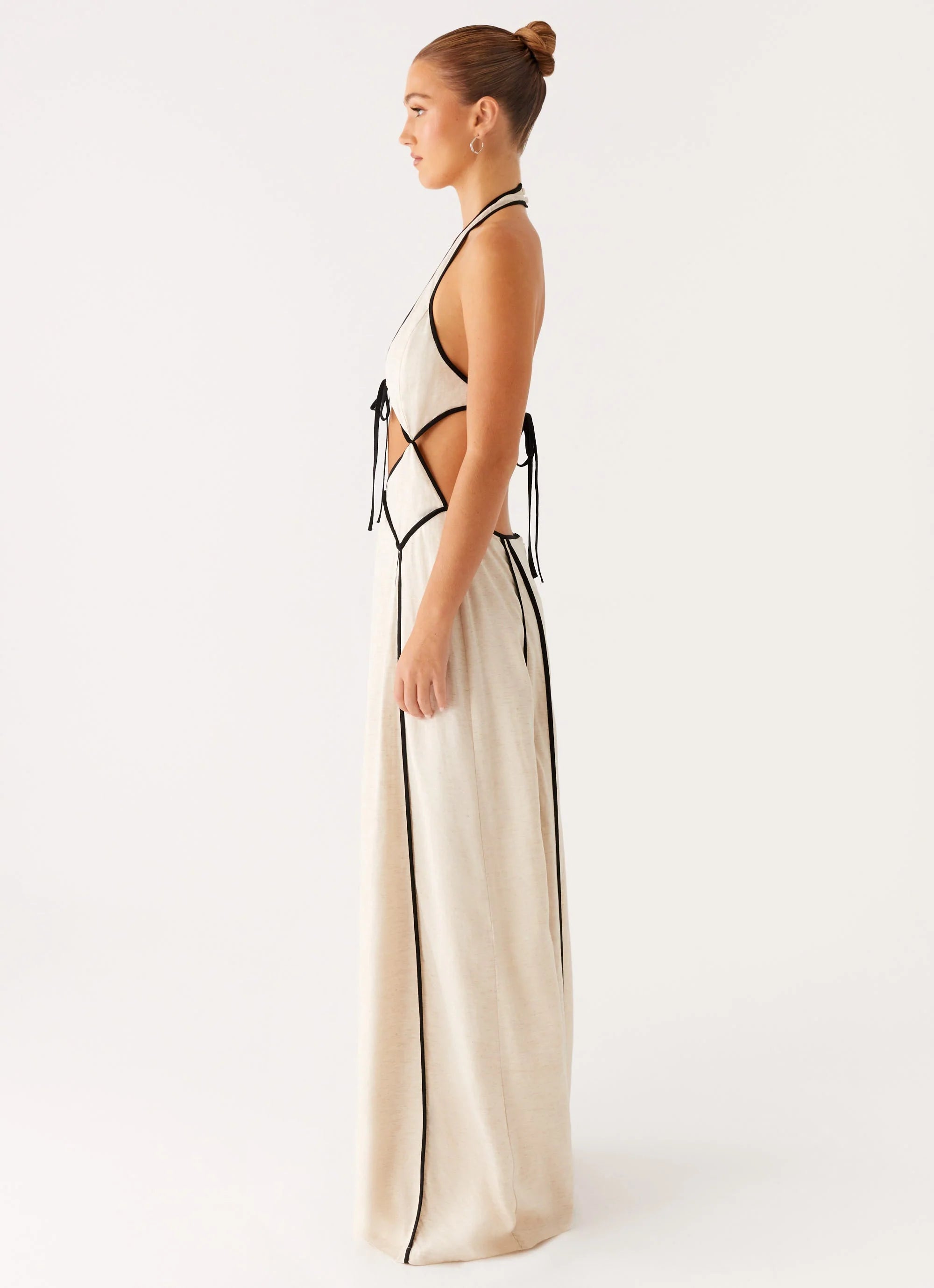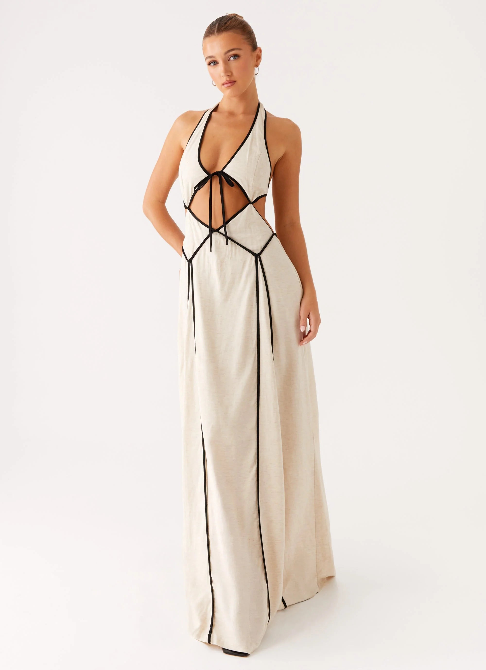 Sultry and playful, the Sonnet Maxi Dress features a halter neckline with statement cut-outs, black binding accents, and an open back with tie and zip closure. Its loose fit and dramatic silhouette make it an after-dark dream.