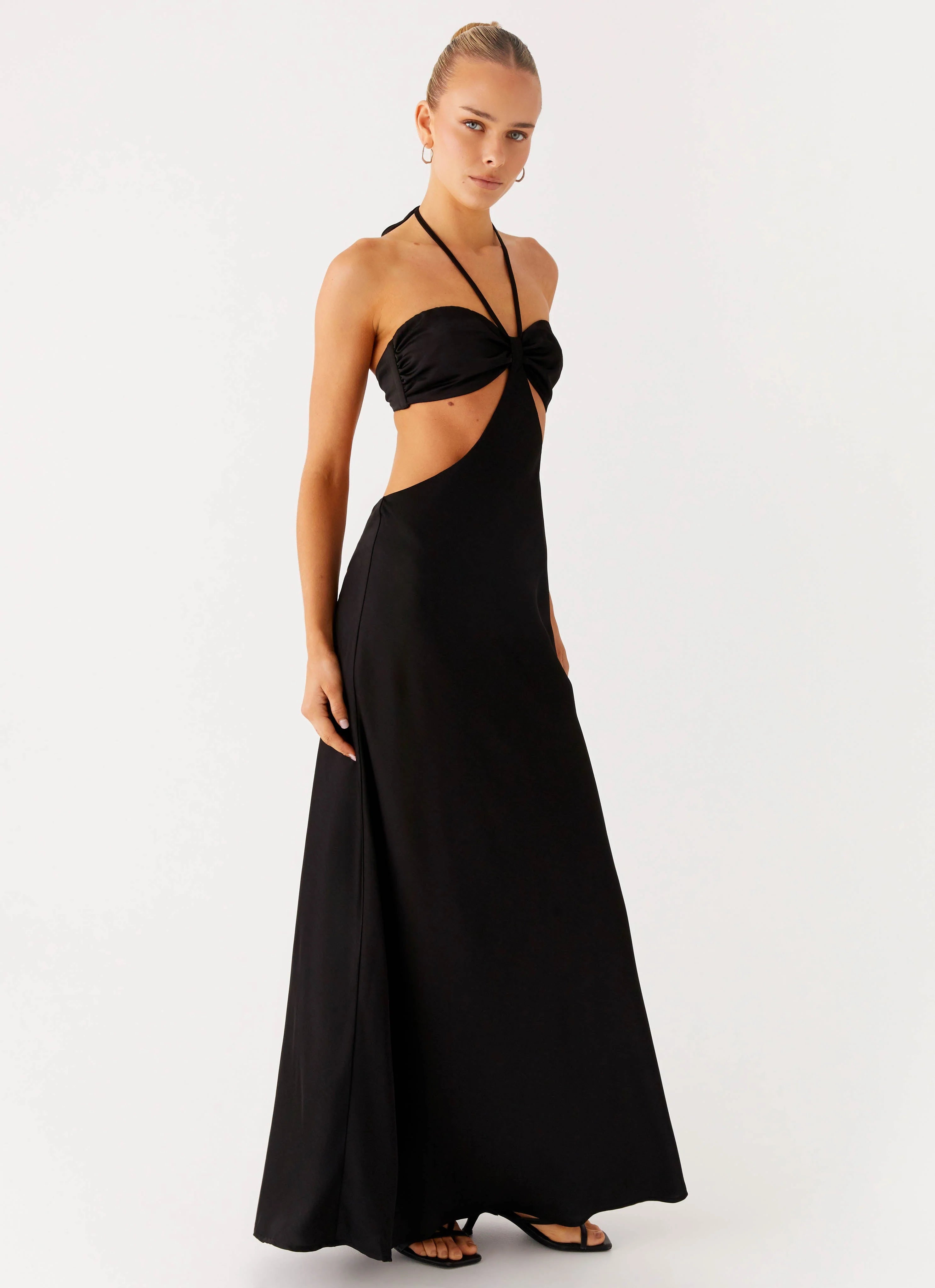 The Sweetheart Cut Out Maxi Dress combines romantic details with bold design. Featuring a sweetheart neckline and thin neck tie straps, it’s crafted with side cut-outs and finished with silicone neckline taping for a secure fit. Fully lined for comfort, it closes with a back button and side hook and eye.