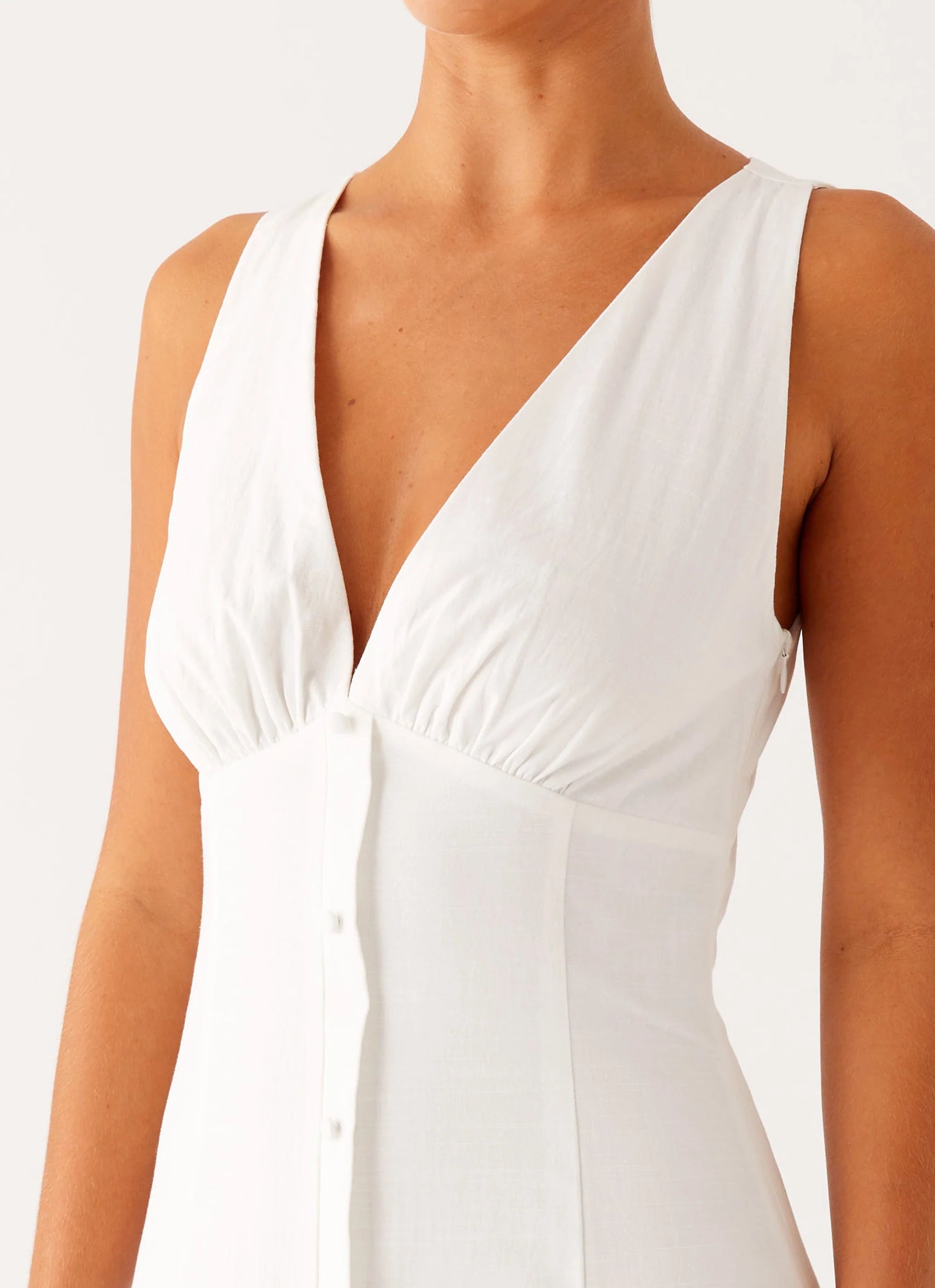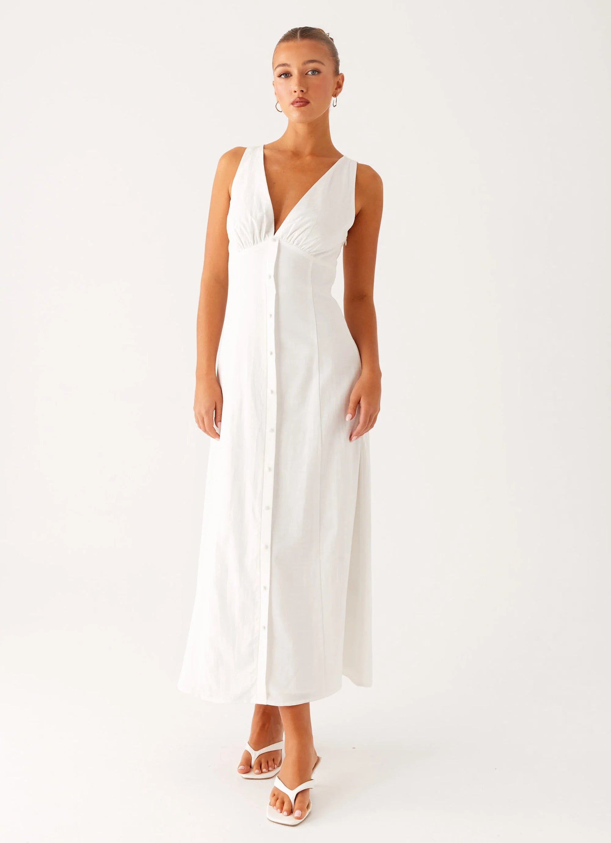 The Tamsin Maxi Dress is effortless and airy in crisp white linen. Featuring a flattering V neckline and button-down front, it’s made for sun-soaked days and warm nights that call for something easy, yet elevated.
