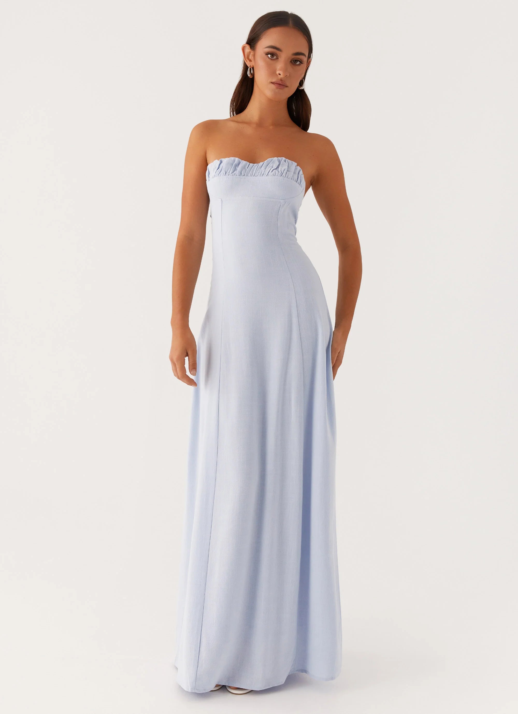 The Tayla Linen Maxi Dress is the epitome of effortless elegance, designed for those balmy nights under golden skies. Featuring a strapless neckline, this dress beautifully highlights your shoulders while providing a flattering fit. The frill bustier detailing adds a touch of romance, enhancing the overall silhouette.