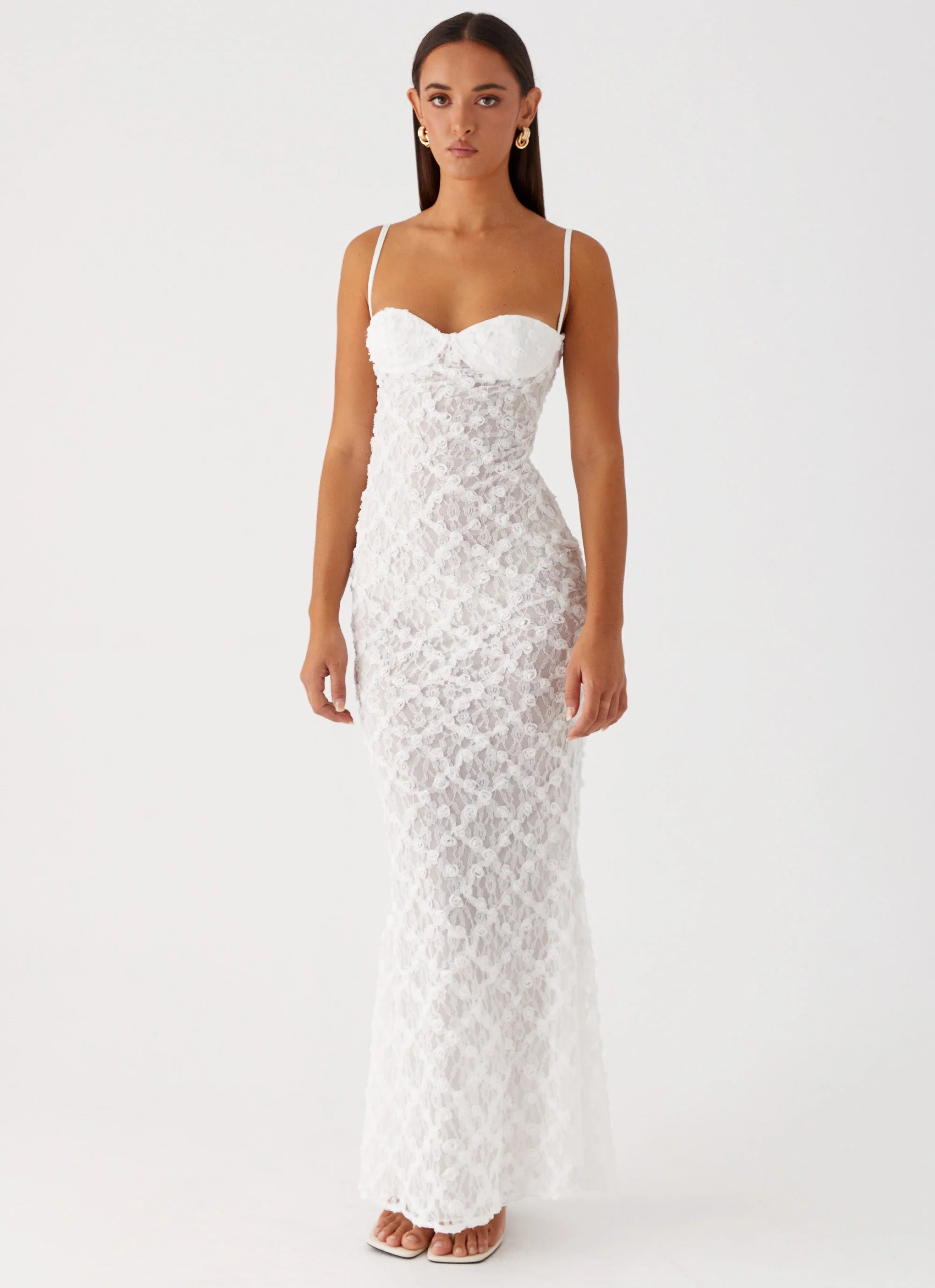Radiate confidence in the That Girl Maxi Dress. With a sweetheart neckline and floral textured lace, this body-con silhouette highlights your curves while ensuring a show-stopping presence at any evening event. Perfect for golden nights and unforgettable moments.