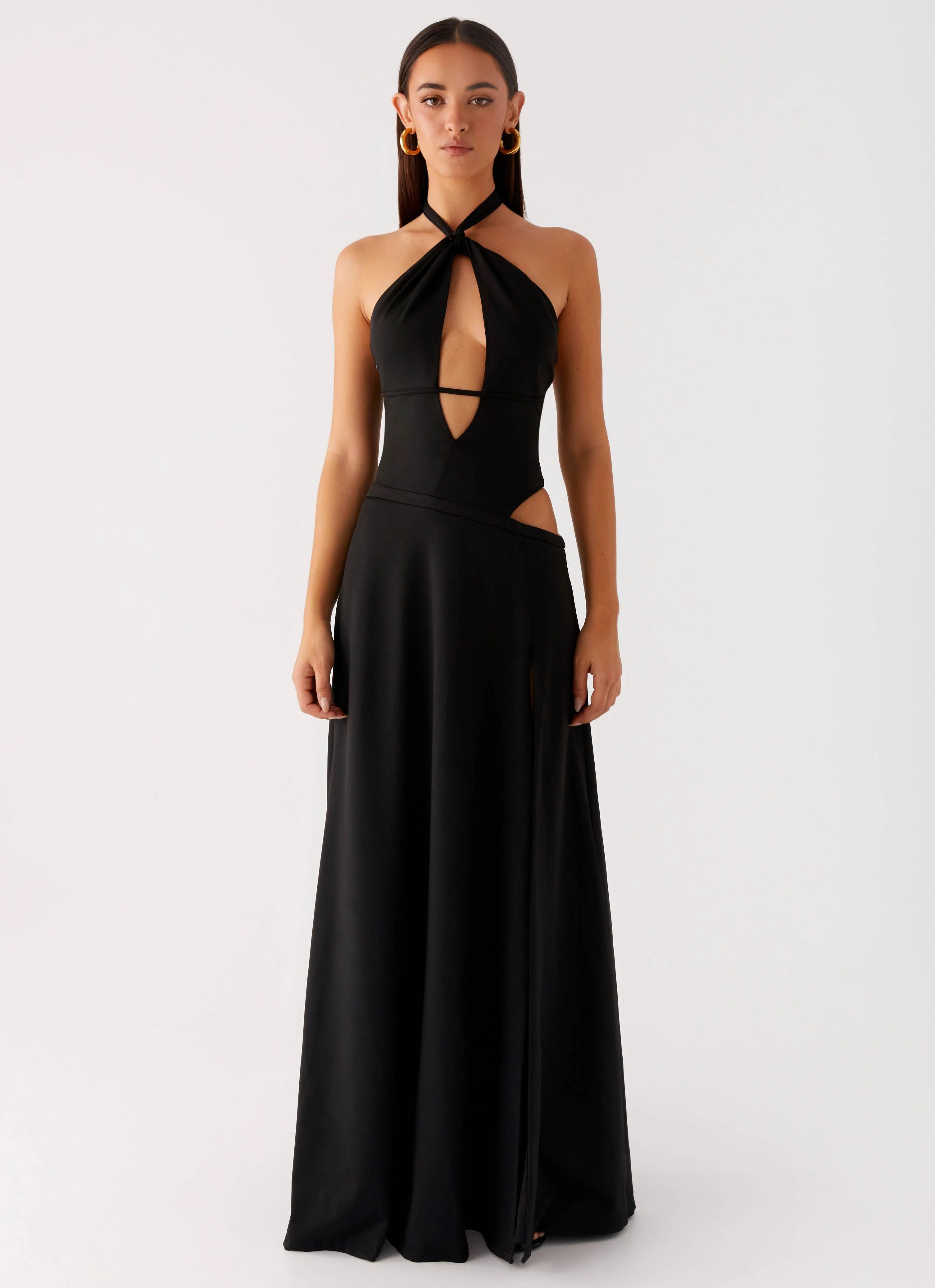The Turner Maxi Dress features a flattering halter neckline with thick neck tie straps and a maxi length silhouette. Designed with front and side cut-outs, a low back, and crafted from stretch jersey with full lining, it offers a perfect blend of comfort and bold style.