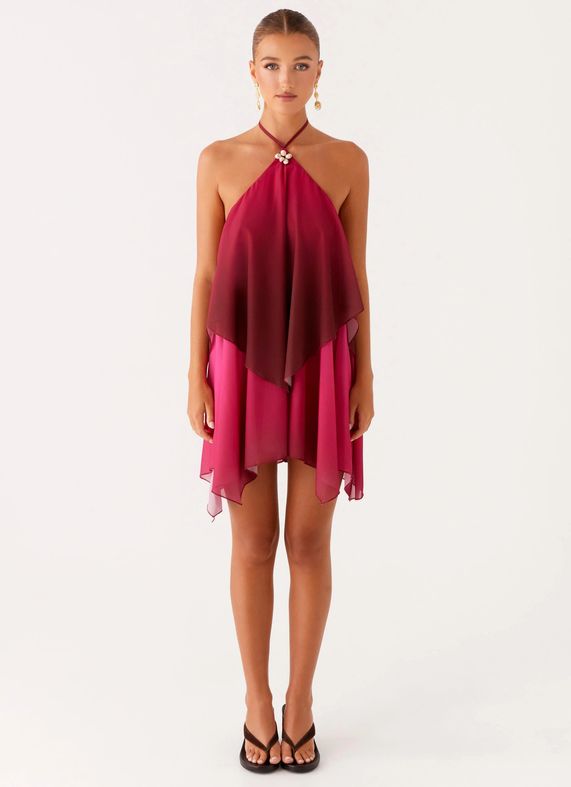 Twin Flame Mini Dress featuring an open back, halter neckline, and exclusive Peppermayo print. This bold, eye-catching dress is made to turn heads with its sultry silhouette and unique pattern, perfect for those unforgettable nights out.