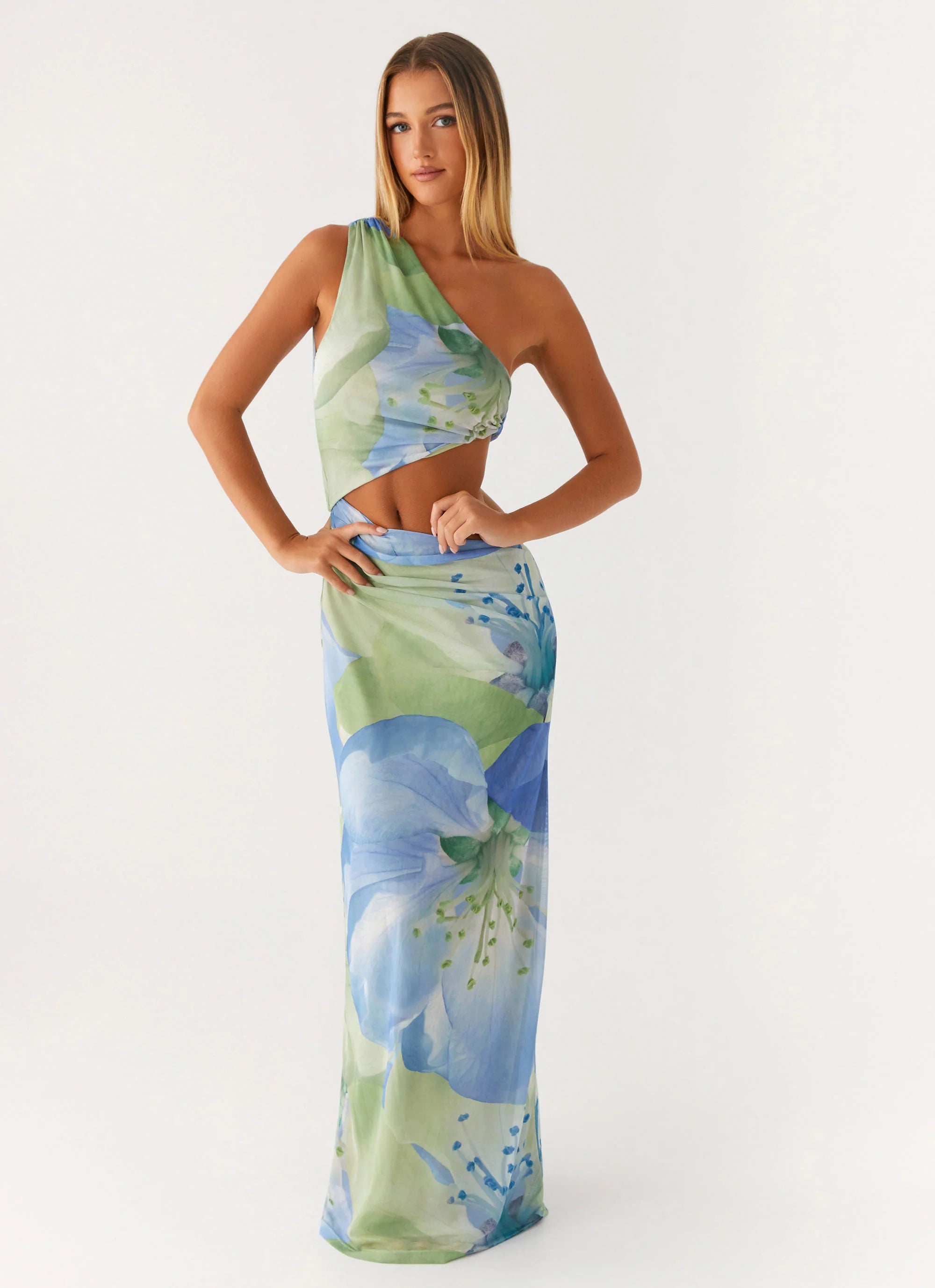 The Wilder Maxi Dress offers a flattering maxi length with ruched sides that accentuate the silhouette. It features an exclusive Peppermayo print, perfect for making a bold statement with a touch of style.