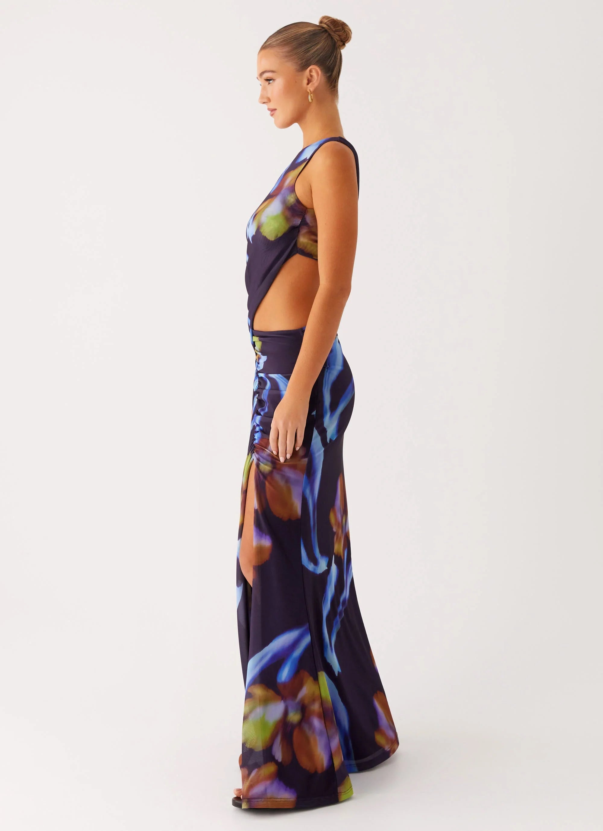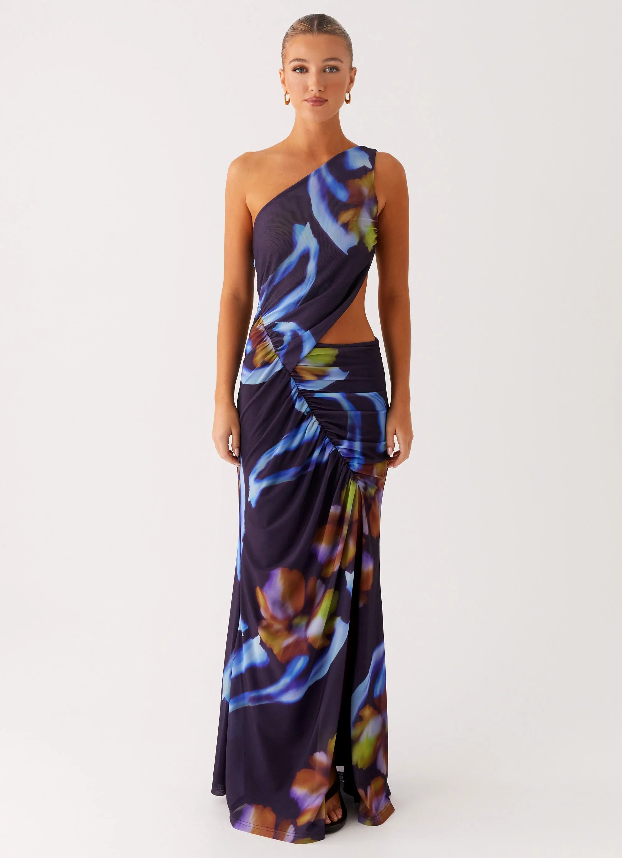 Elevate your evening look with the Zanzibar Maxi Dress in Dark Floral. Featuring a striking asymmetrical neckline and a daring front cut-out, this maxi dress is crafted from stretch mesh for effortless movement. Fully lined for comfort, it boasts ruched sides that flatter every curve and an exclusive print with unique placement on each piece. Perfect for nights that call for bold silhouettes and unforgettable style.