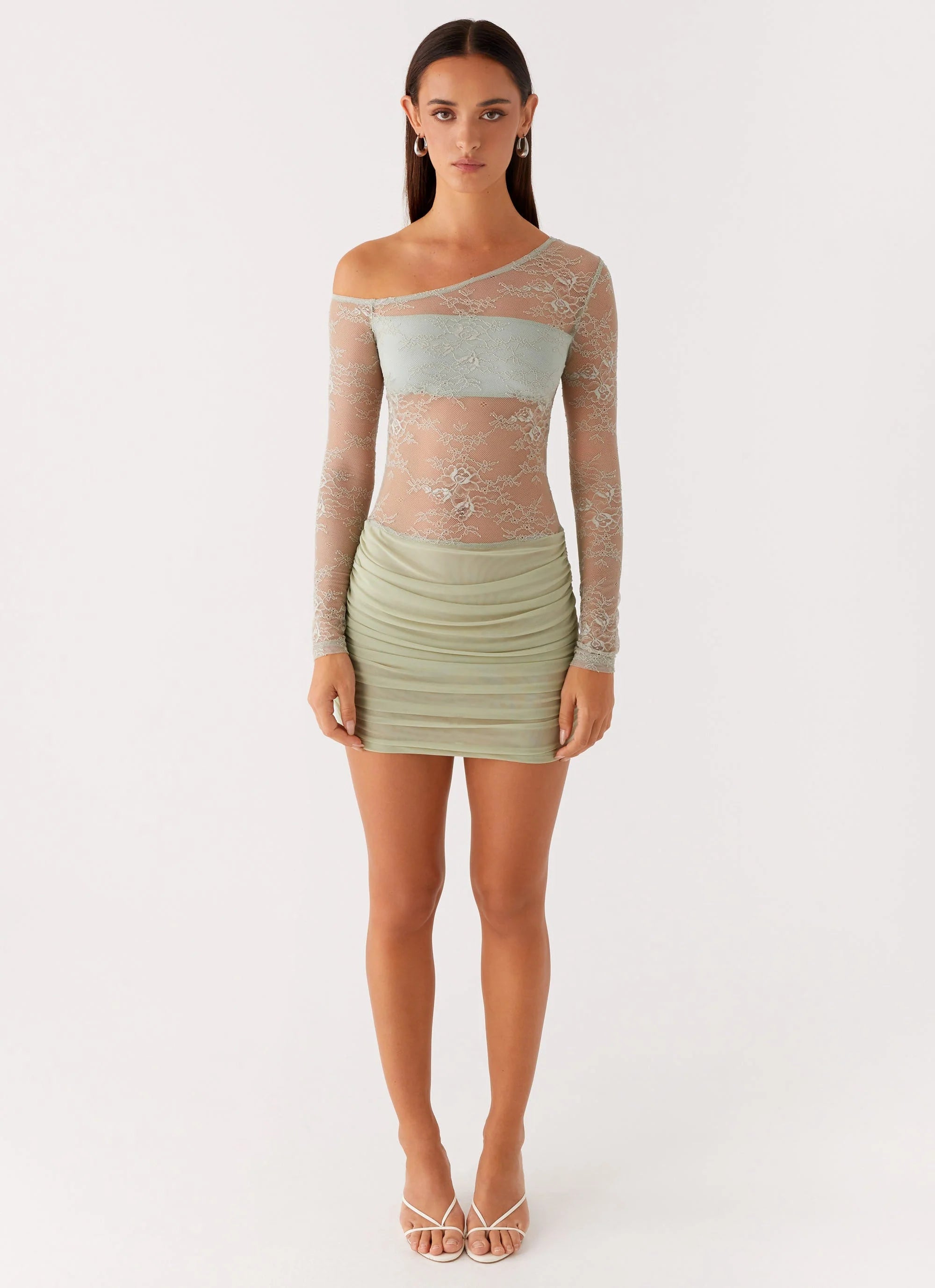The Zenni Mini Dress in sage turns heads with its sheer lace bodice, ruched skirt detail, and body-hugging stretch fit. With long sleeves and full lining through the bust and skirt, this mini blends sultry textures with effortless wearability.